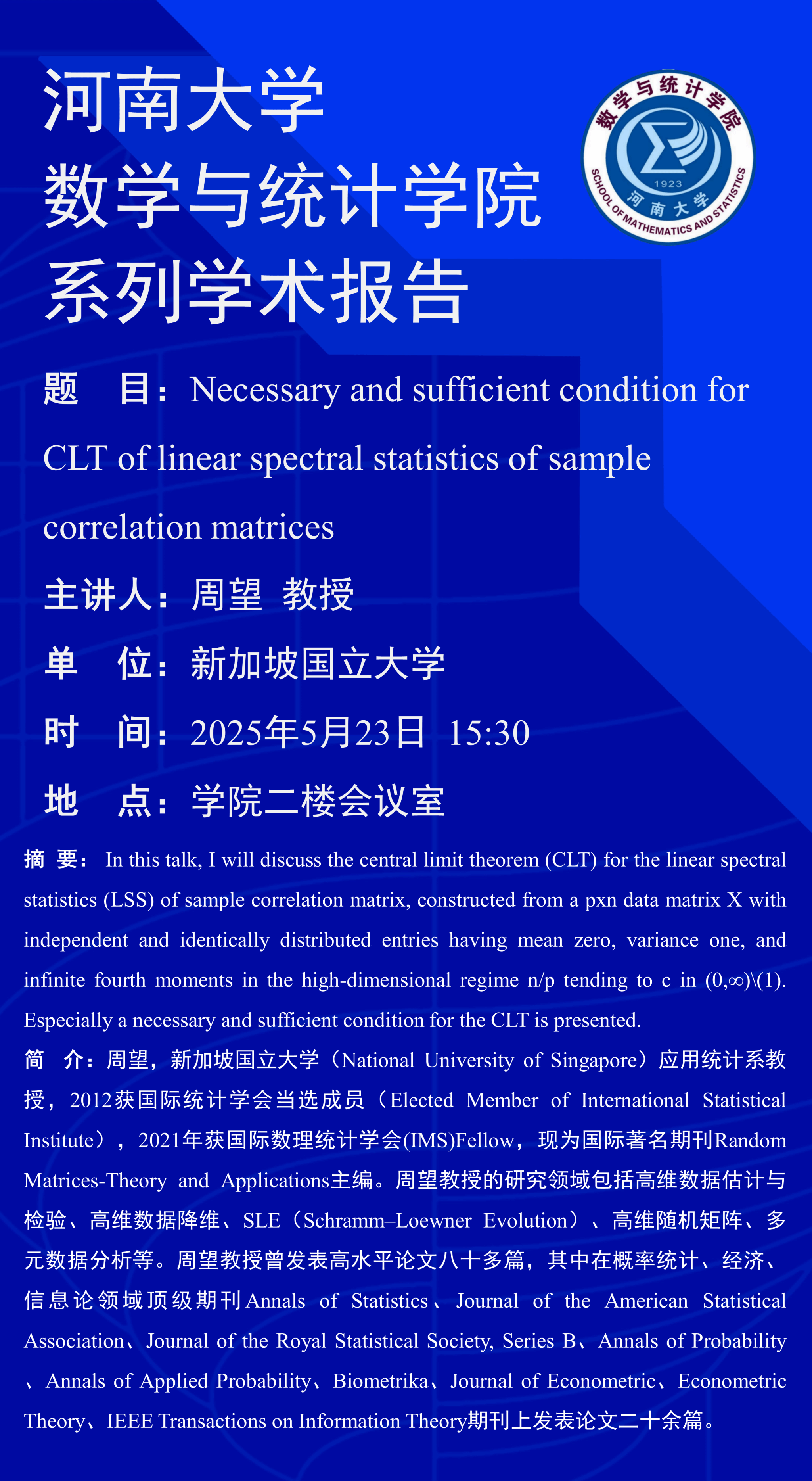 周望:Necessary and sufficient condition for CLT of linear spectral statistics of sample correlation matrices(时间:5月23日)