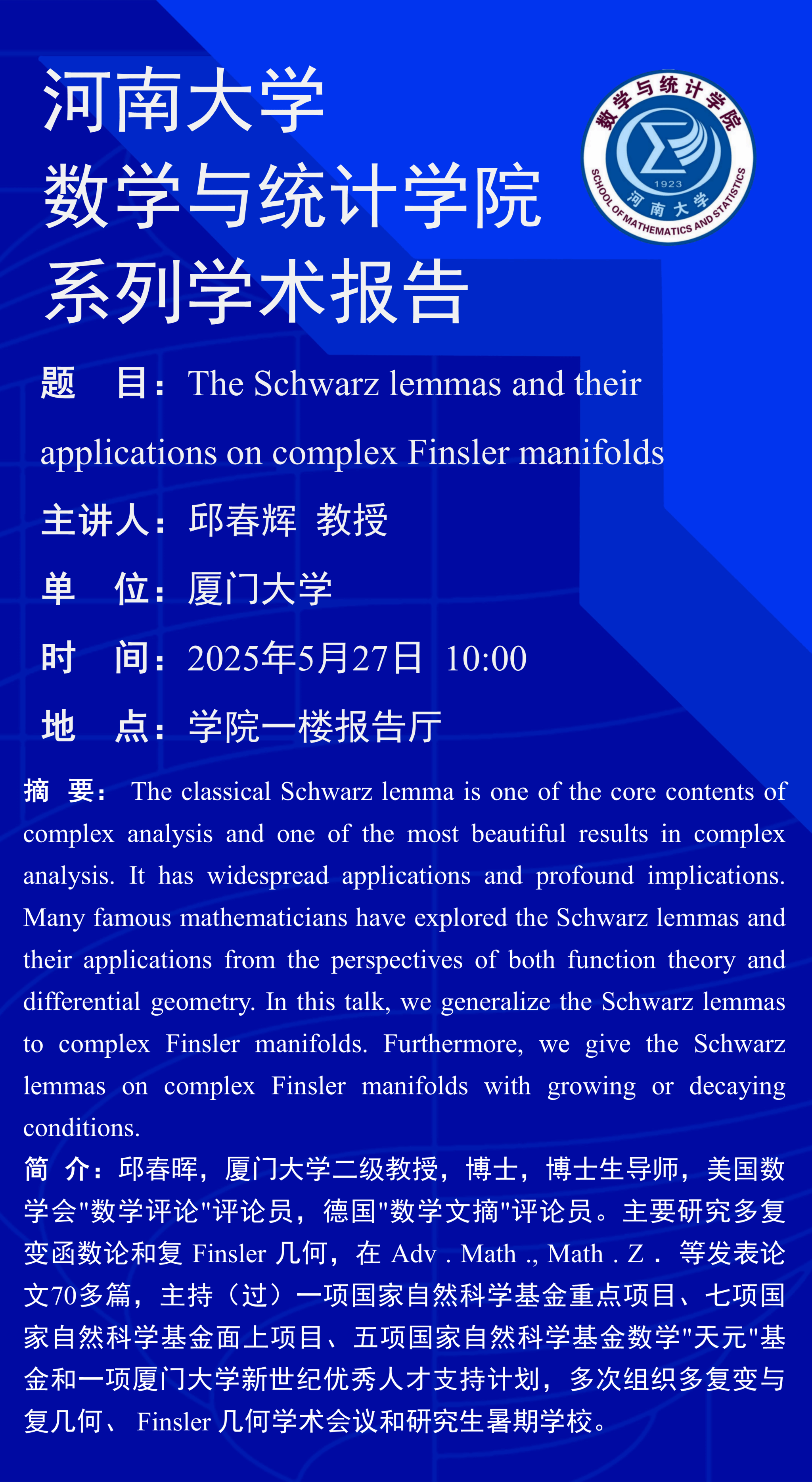 邱春辉:The Schwarz lemmas and their applications on complex Finsler manifolds(时间:5月27日)