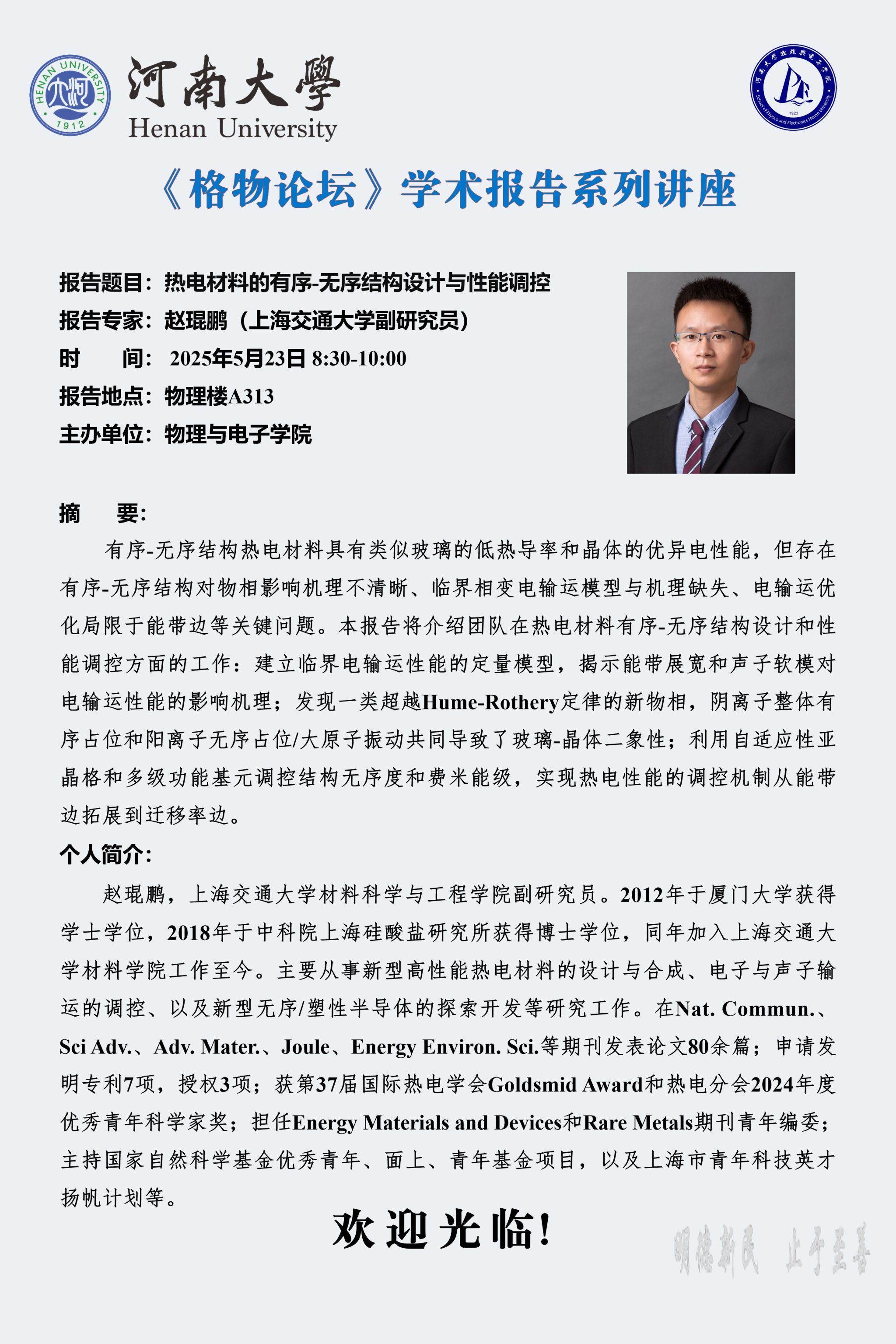 赵琨鹏:热电材料的有序-无序结构设计与性能调控(时间:5月23日)