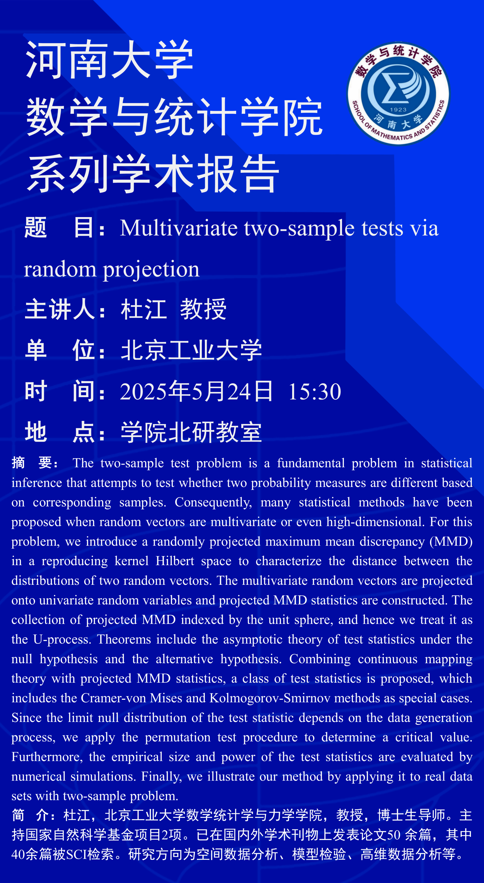 杜江:Multivariate two-sample tests via random projection(时间:5月24日)