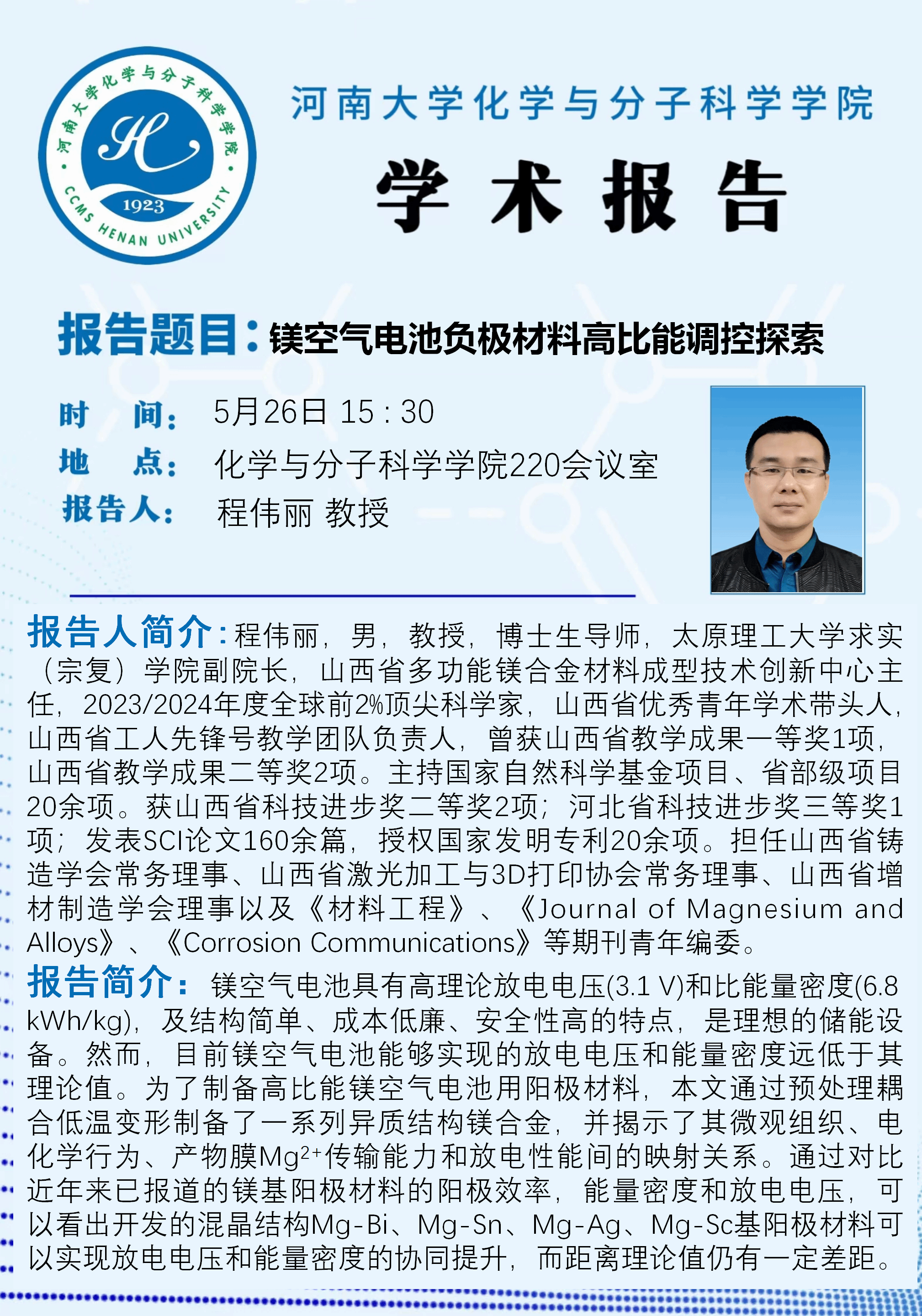程伟丽:镁空气电池负极材料高比能调控探索(时间:5月26日)