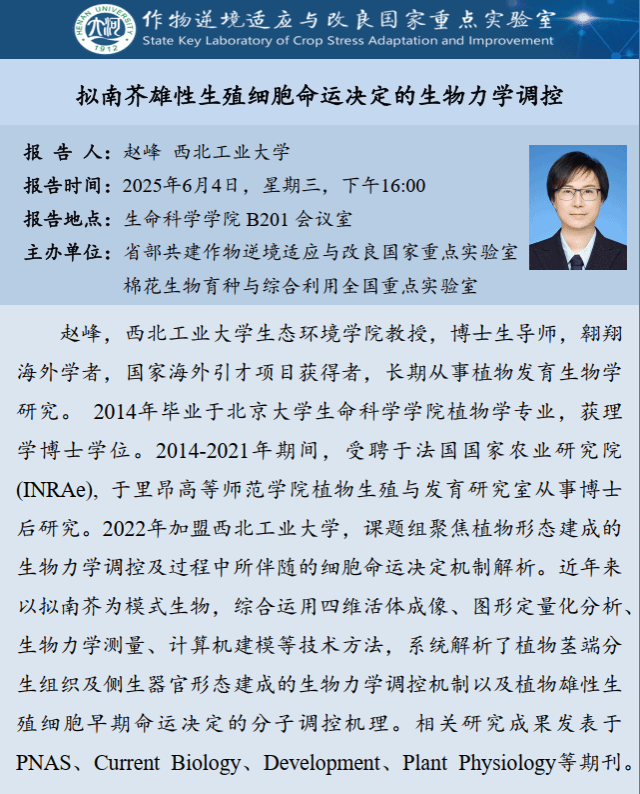 赵峰:拟南芥雄性生殖细胞命运决定的生物力学调控(时间:6月4日)