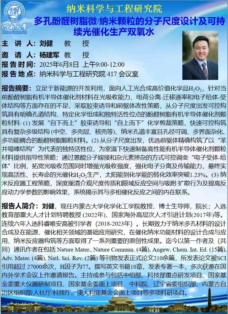 刘键:多孔酚醛树脂微/纳米颗粒的分子尺度设计及可持续光催化生产双氧水(时间:6月8日)