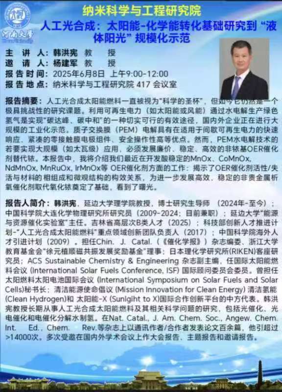 韩洪宪:太阳能-化学能转化基础研究到 “液体阳光” 规模化示范(时间:6月8日)