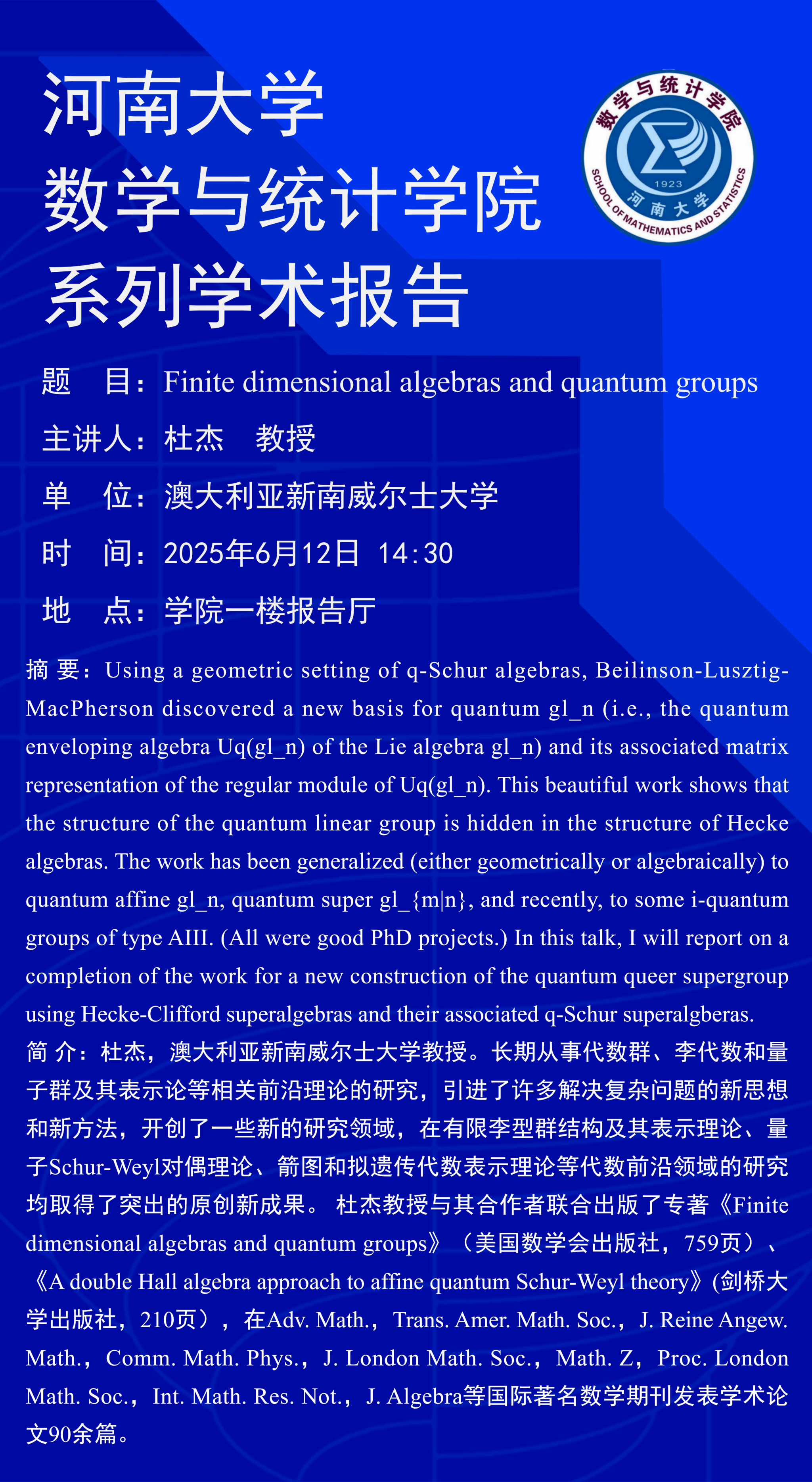 杜杰:Finite dimensional algebras and quantum groups (时间:6月12日)