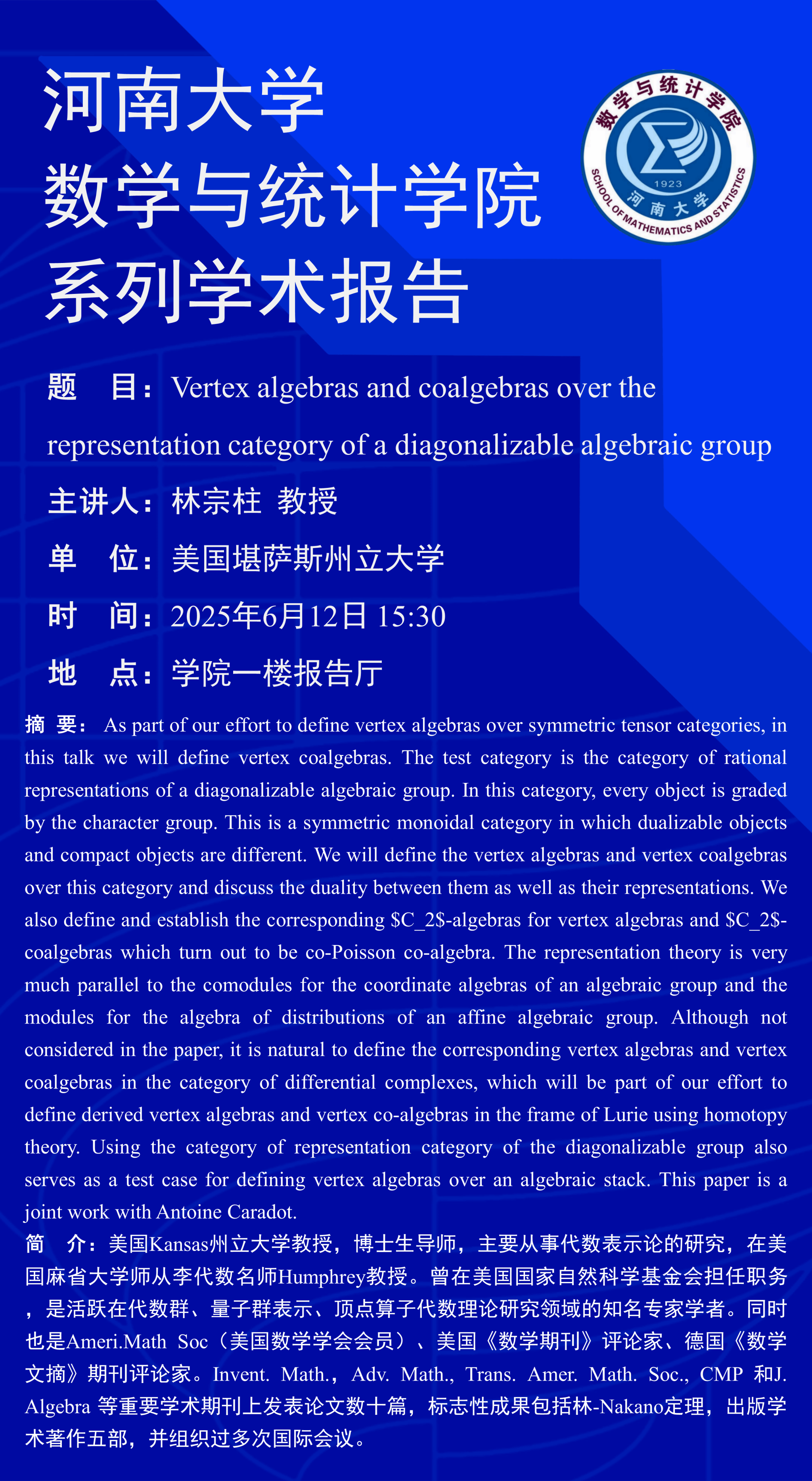 林宗柱:Vertex algebras and coalgebras over the representation category of a diagonalizable algebraic group(时间:6月12日)