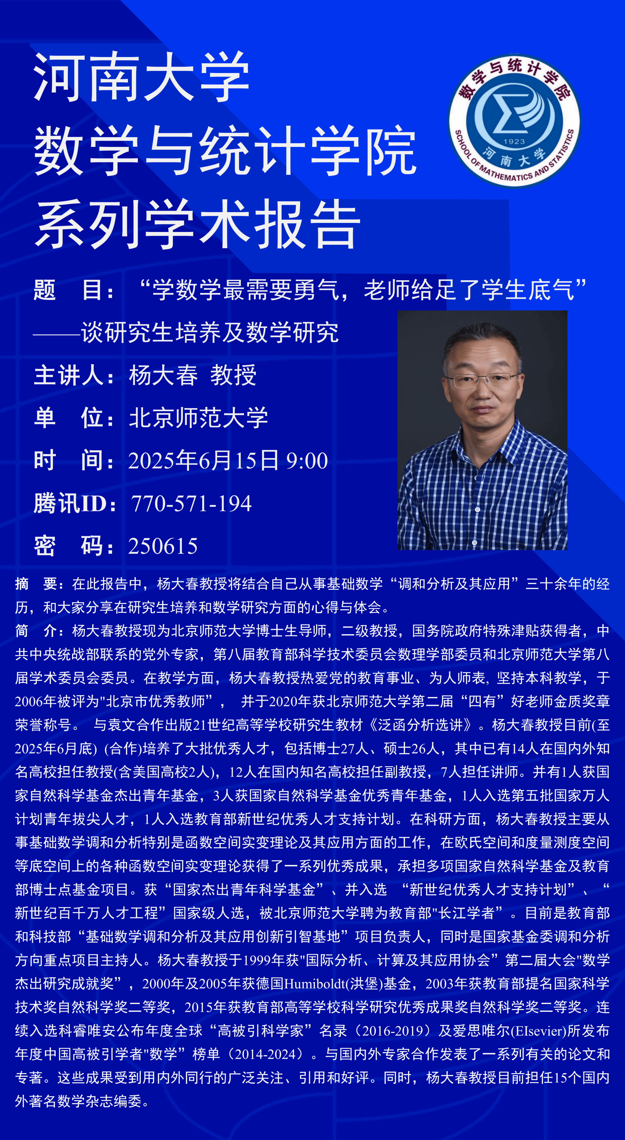杨大春:“学数学最需要勇气,老师给足了学生底气”——谈研究生培养及数学研究(时间:6月15日)