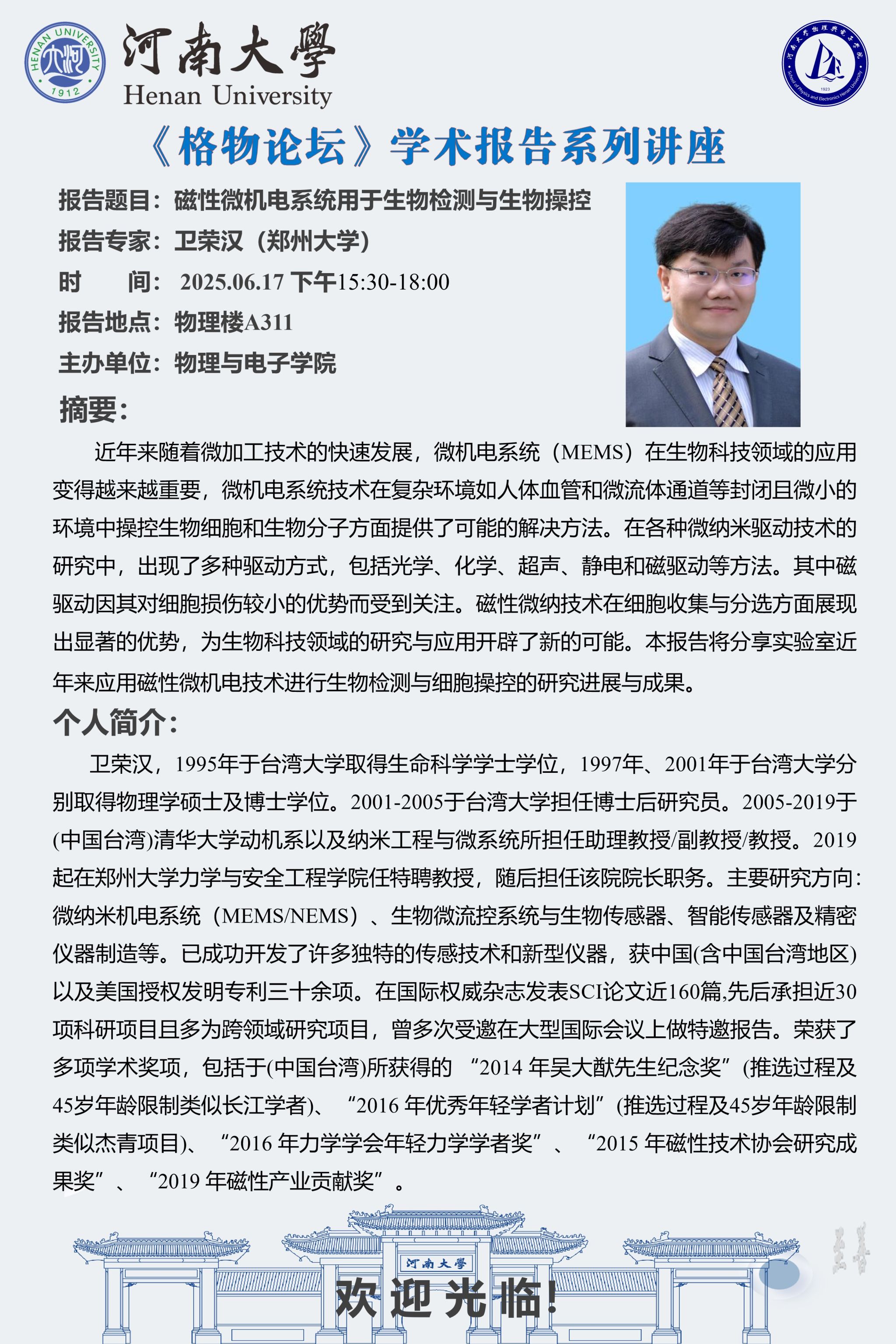 卫荣汉:磁性微机电系统用于生物检测与生物操控(时间:6月17日)