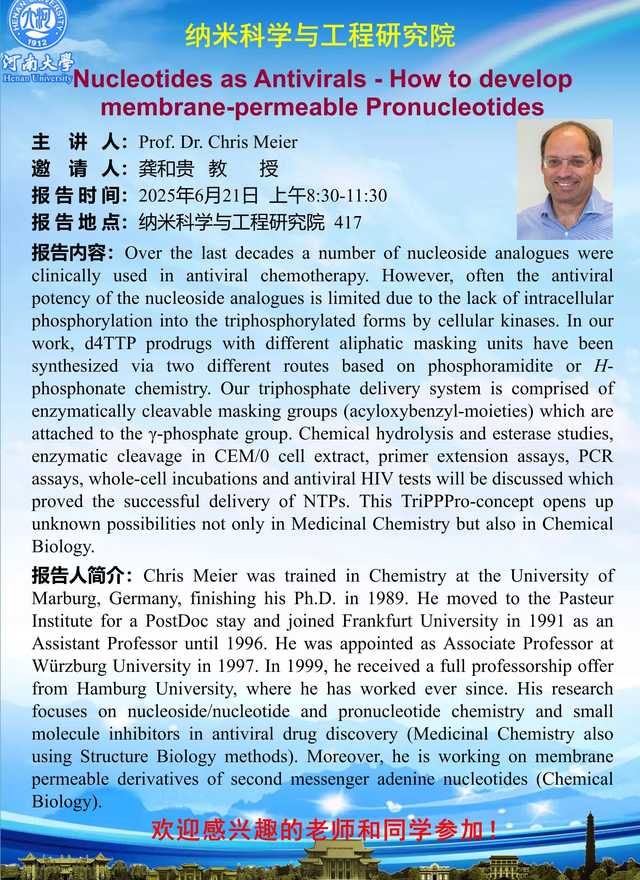 Chris Meier:Nucleotides as Antivirals - How to develop membrane-permeable Pronucleotides (时间:6月21日)