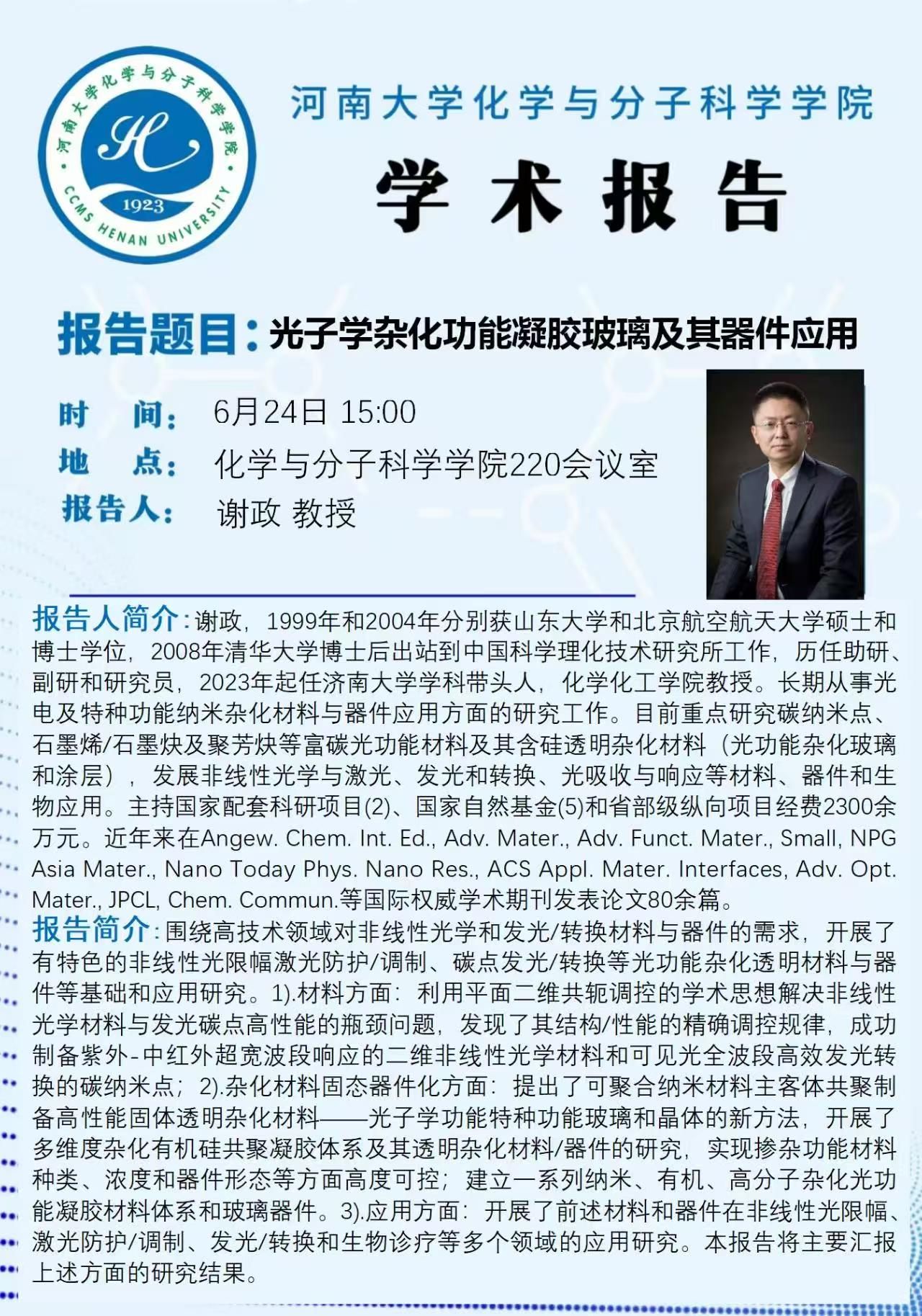 谢政:光子学杂化功能凝胶玻璃及其器件应用(时间:6月24日)