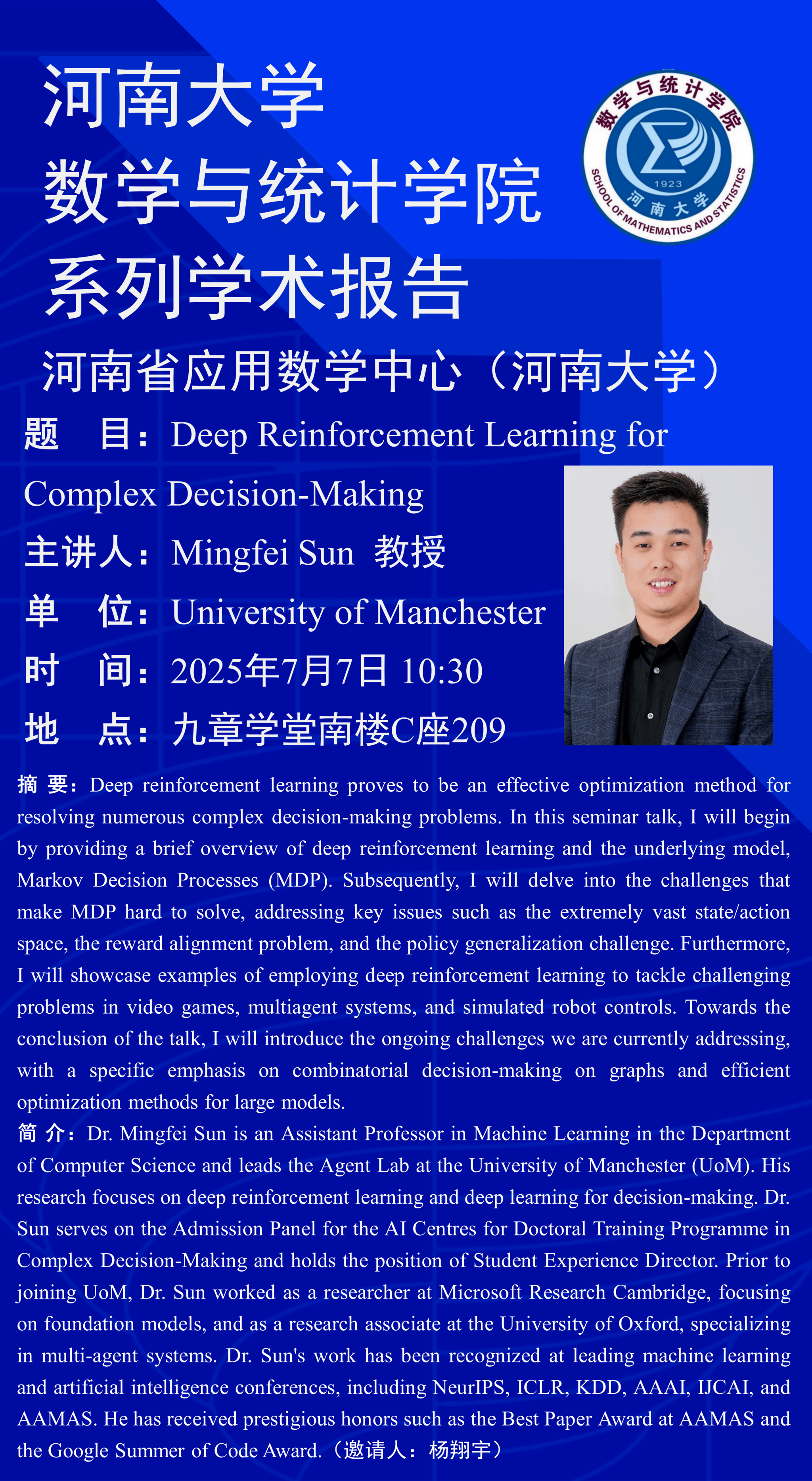 Mingfei Sun:Deep Reinforcement Learning for Complex Decision-Making(时间:7月7日)