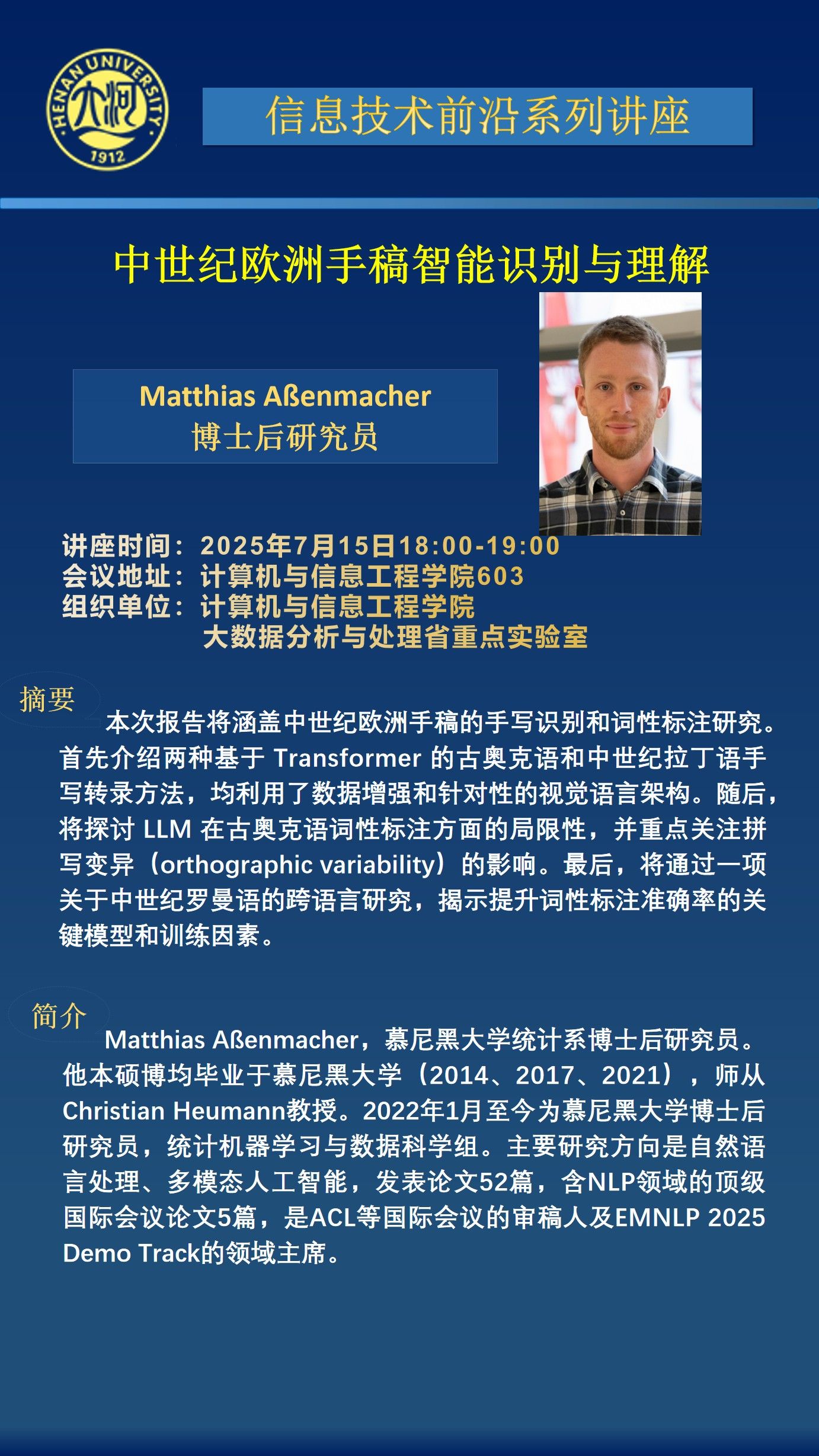 Matthias Aßenmacher:中世纪欧洲手稿智能识别与理解(时间:7月15日)