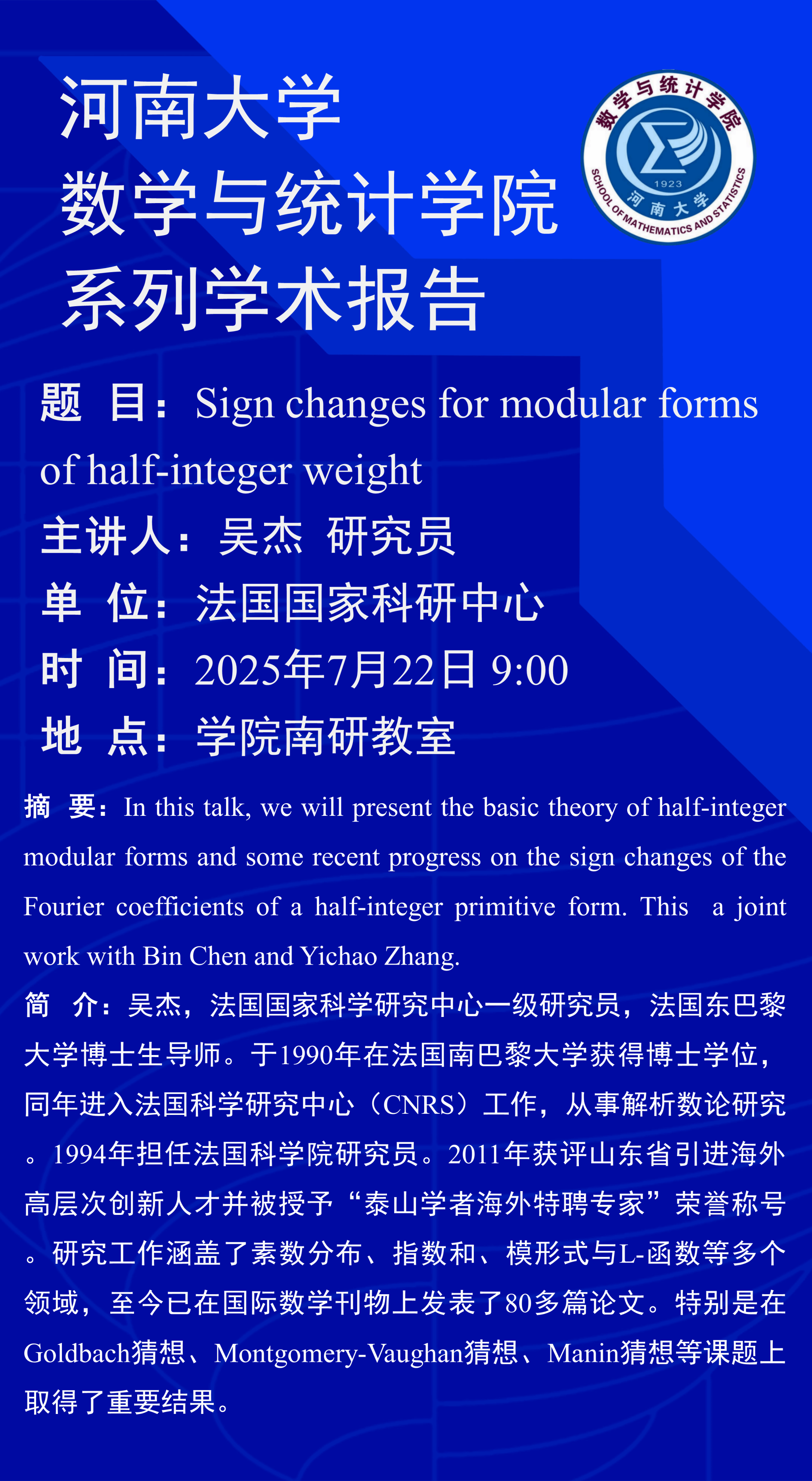 吴杰:Sign changes for modular forms of half-integer weight(时间:7月22日)