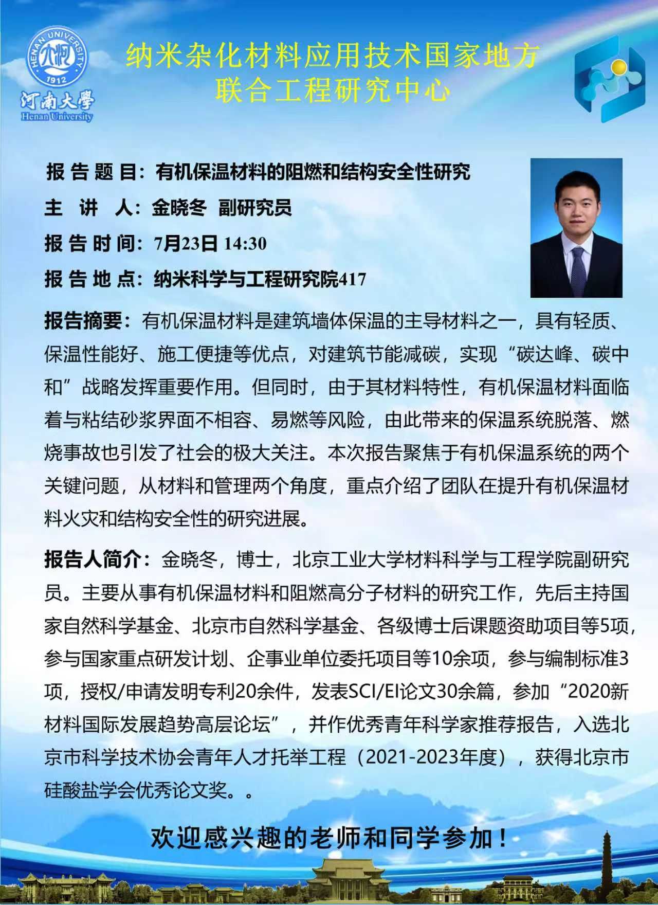 金晓冬:有机保温材料的阻燃和结构安全性研究(时间:7月23日)