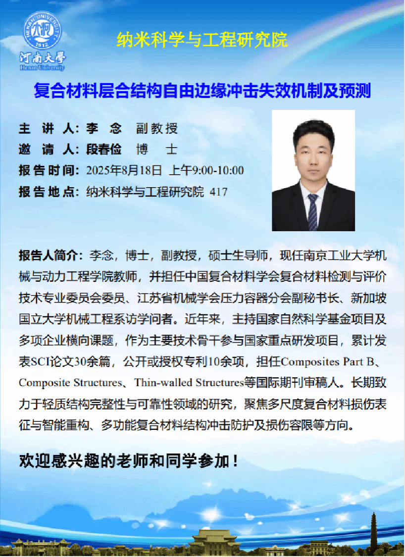 李念:复合材料层合结构自由边缘冲击失效机制及预测(时间:8月18日)