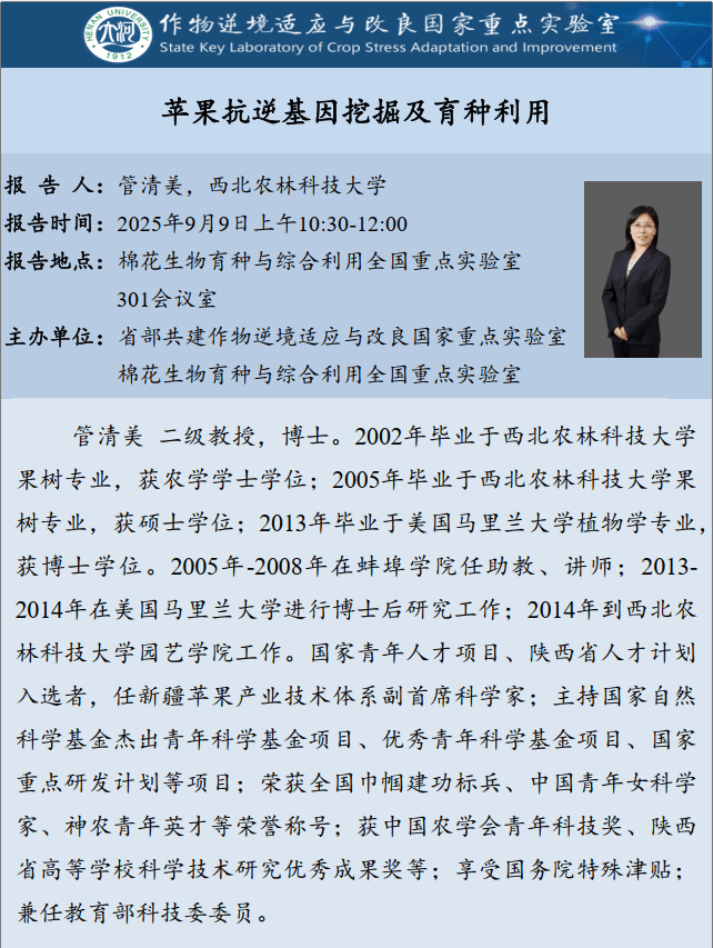 管清美:苹果抗逆基因挖掘及育种利用(时间:9月9日)