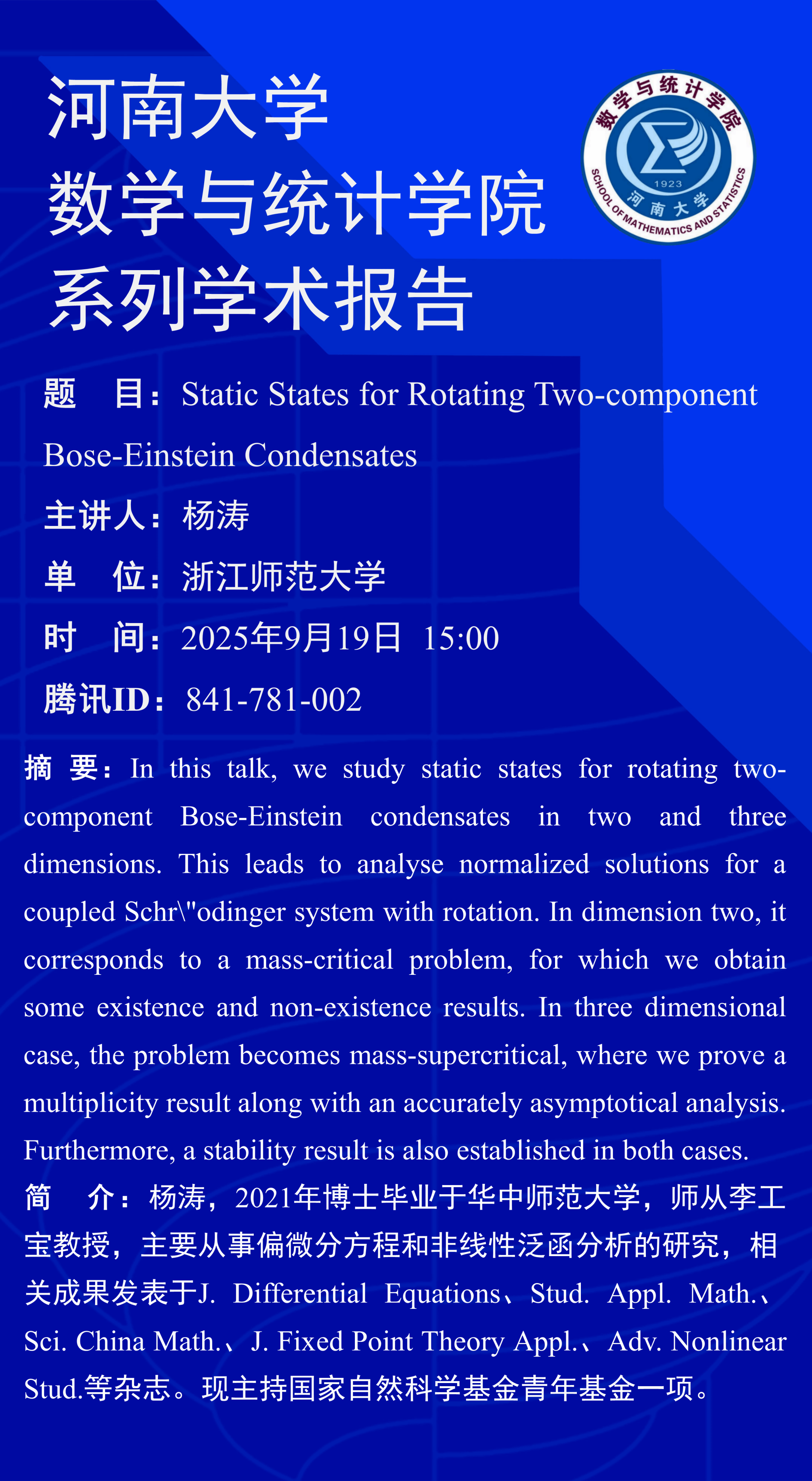 杨涛:Static States for Rotating Two-component Bose-Einstein Condensates(时间:9月19日)