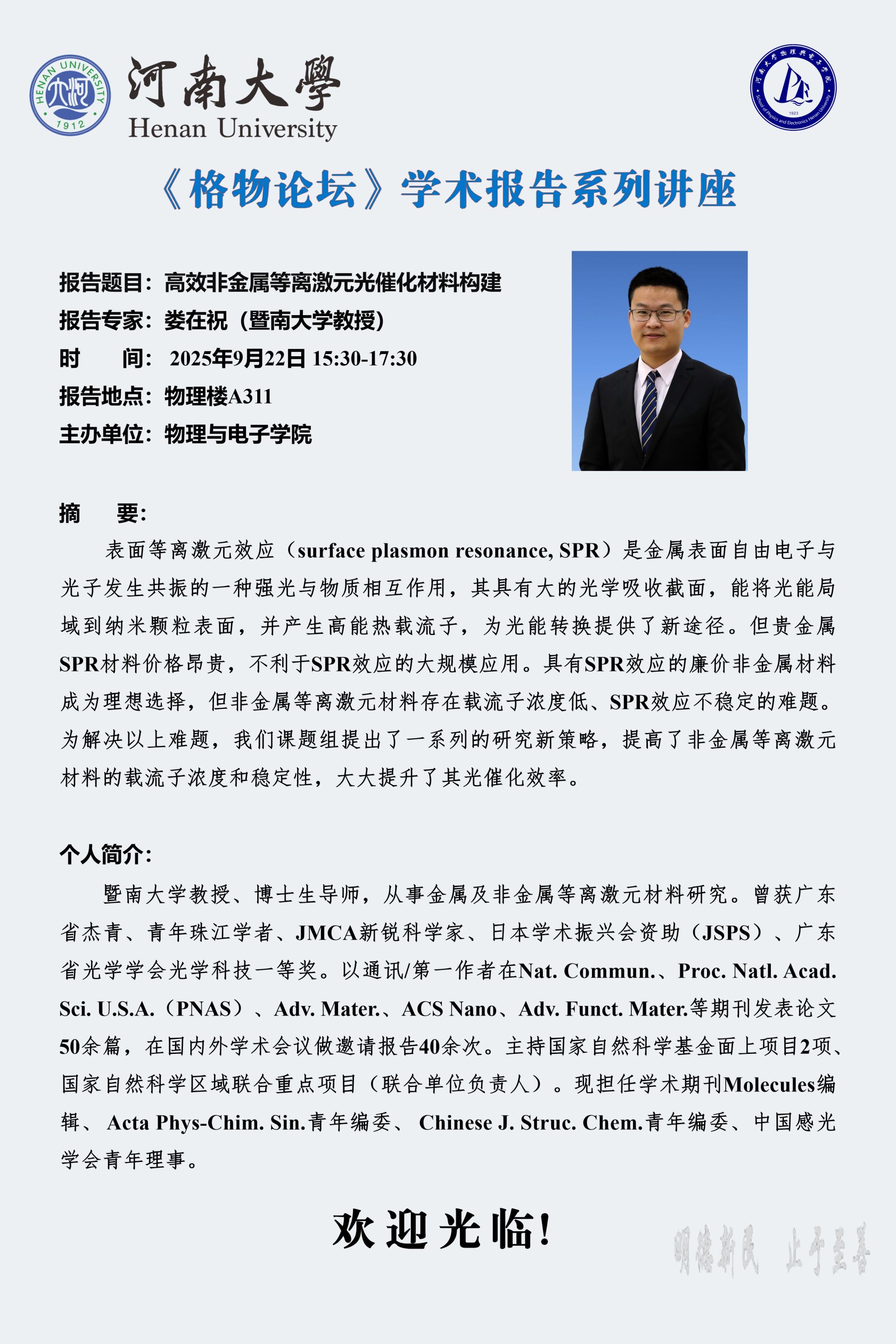 娄在祝:高效非金属等离激元光催化材料构建(时间:9月22日)