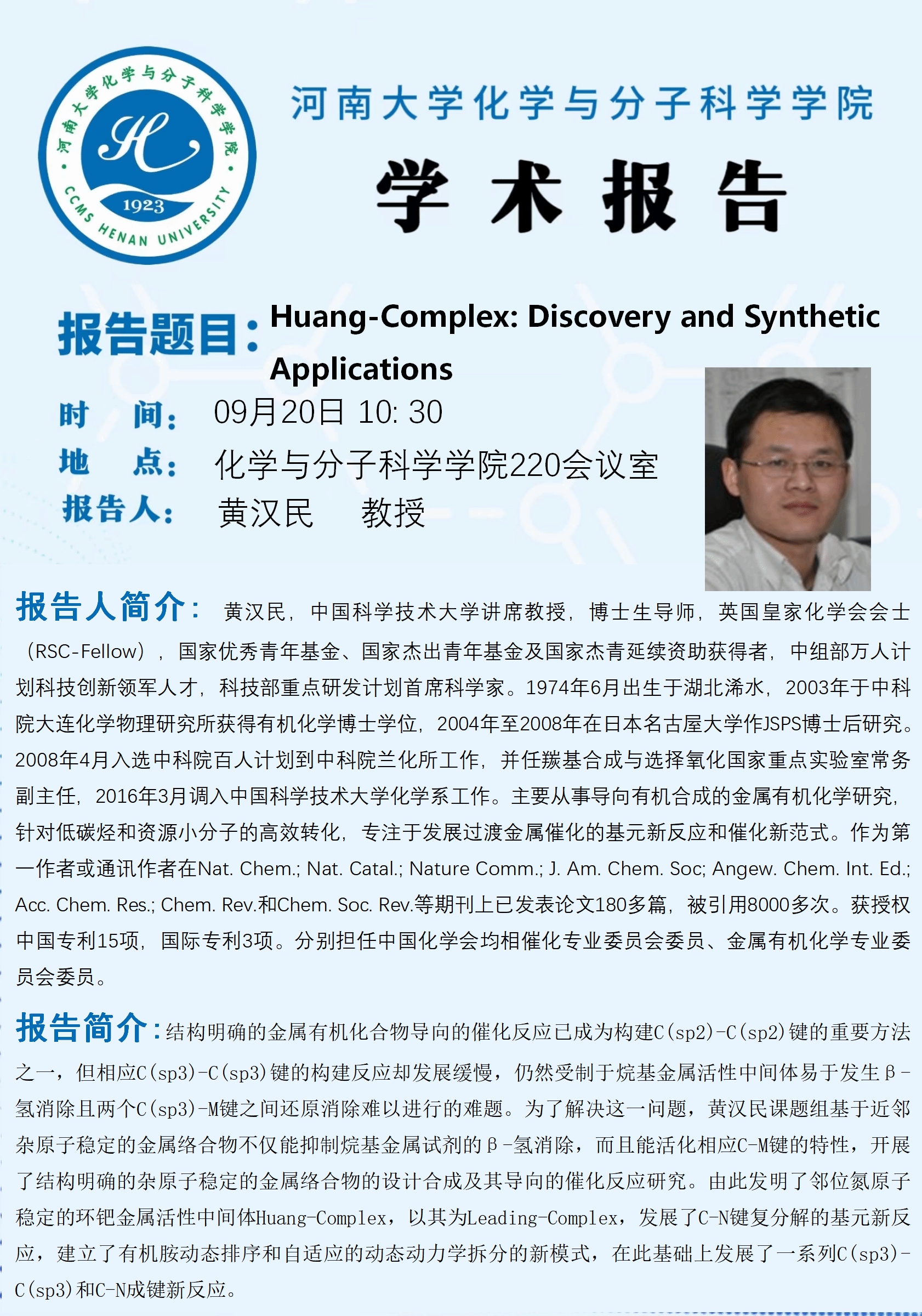 黄汉民:Huang-Complex: Discovery and Synthetic Applications(时间:9月20日)