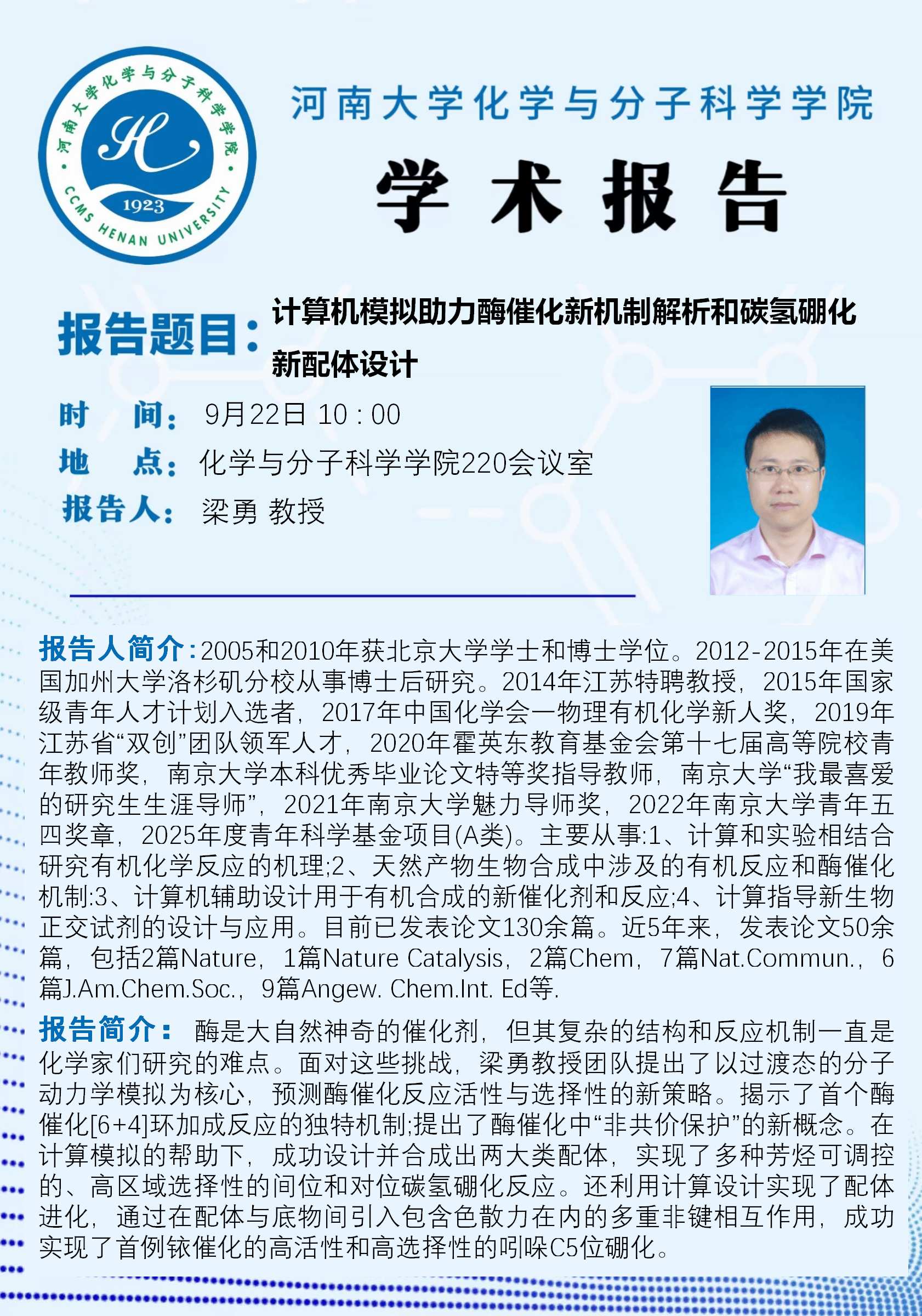梁勇:计算机模拟助力酶催化新机制解析和碳氢硼化新配体设计(时间:9月22日)