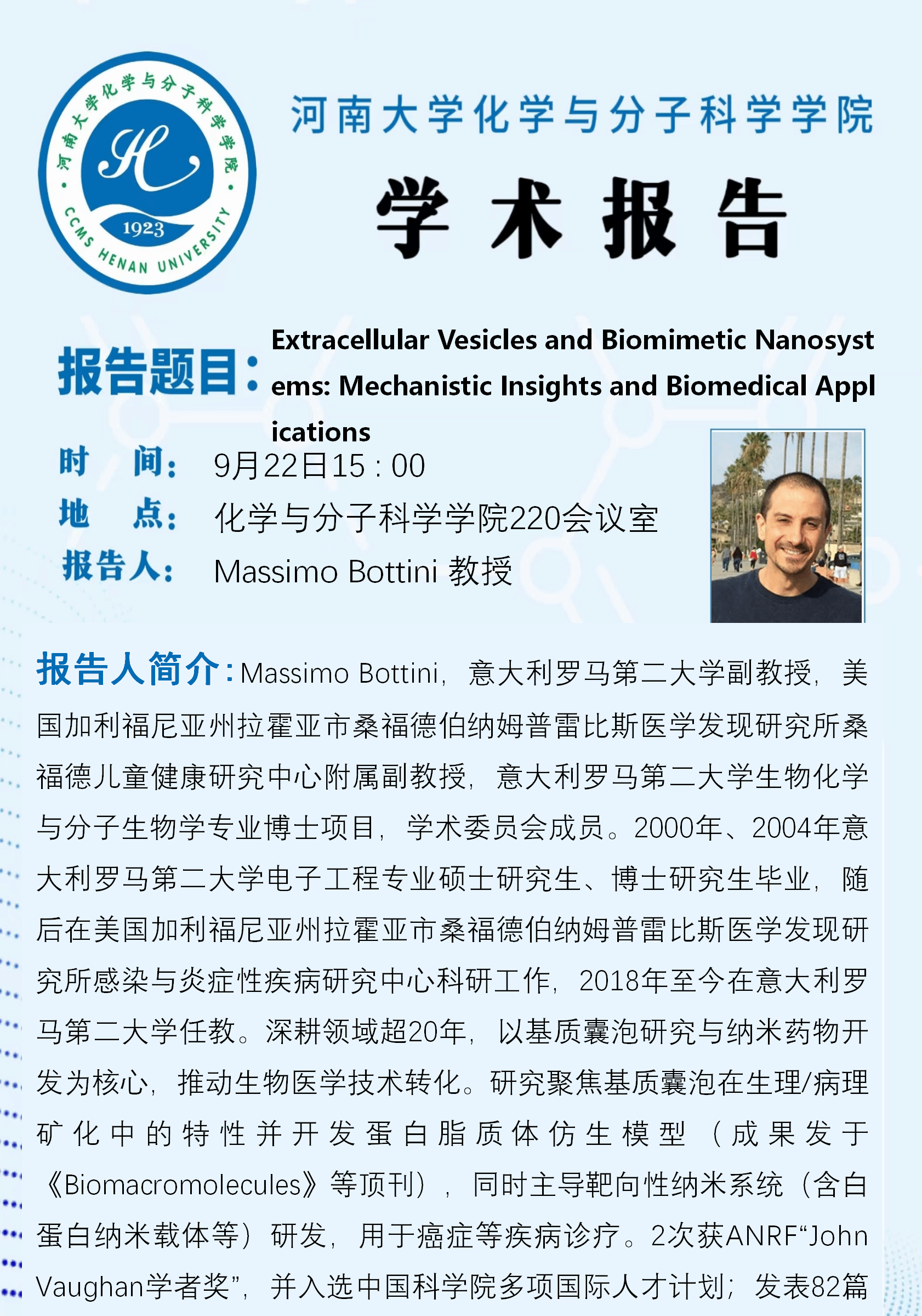 Massimo Bottini:Extracellular Vesicles and Biomimetic Nanosystems: Mechanistic Insights and Biomedical Applications(时间:9月22日)