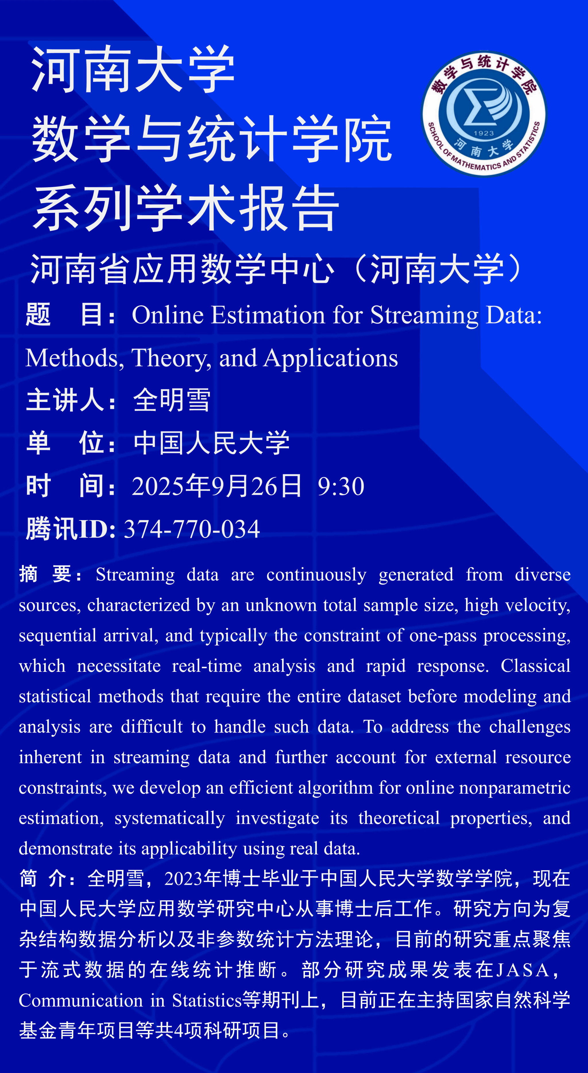 全明雪:Online Estimation for Streaming Data: Methods, Theory, and Applications(时间:9月26日)