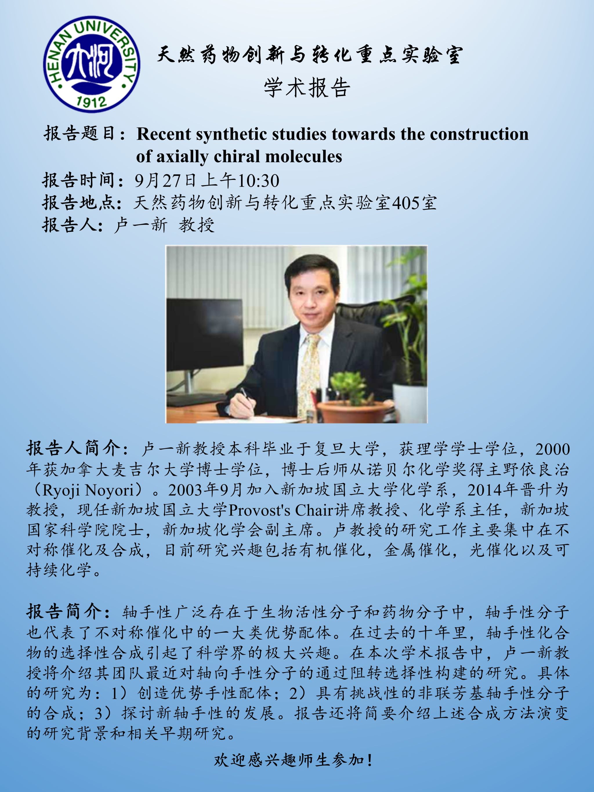卢一新:Recent synthetic studies towards the construction of axially chiral molecules (时间:9月27日)