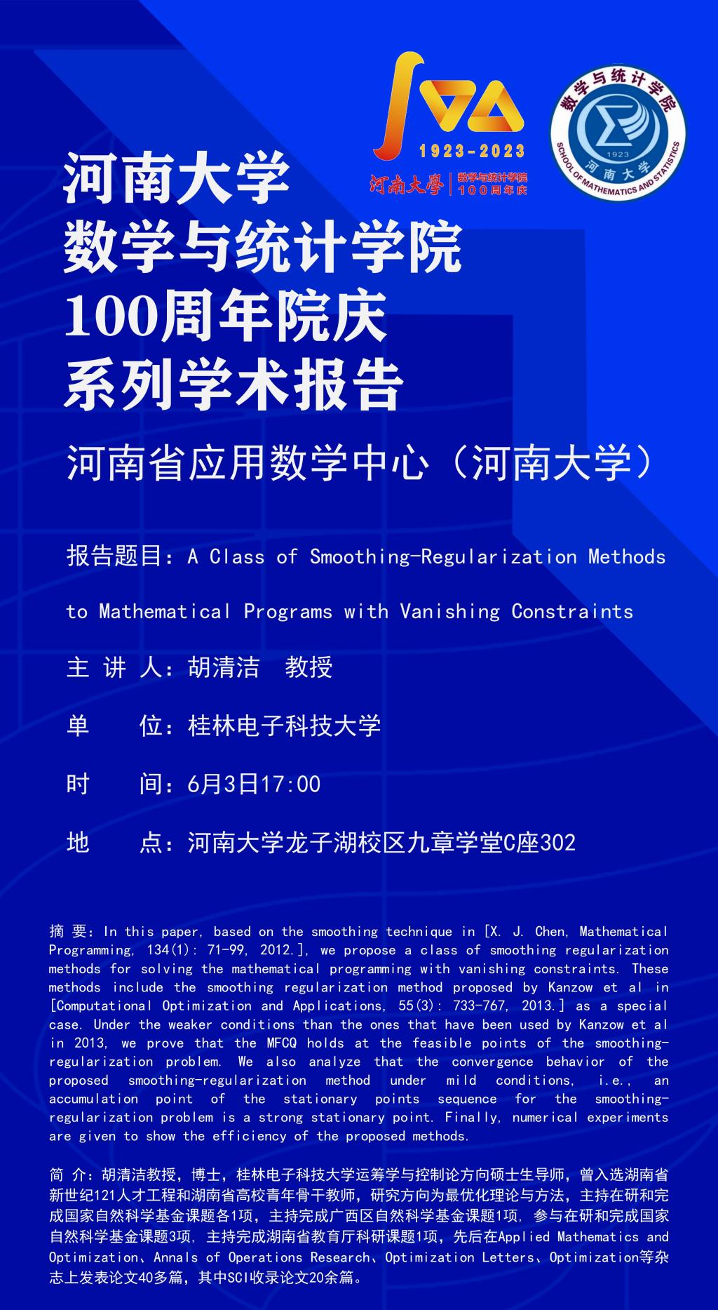 数学与统计学院学术报告会:A Class of Smoothing-Regularization Methods to Mathematical Programs with Vanishing Constraints等(时间:6.3)