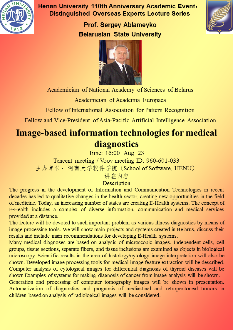 白俄罗斯科学院、欧洲科学院双料院士学术讲座:Image-based information technologies for medical diagnostics(时间8.23)