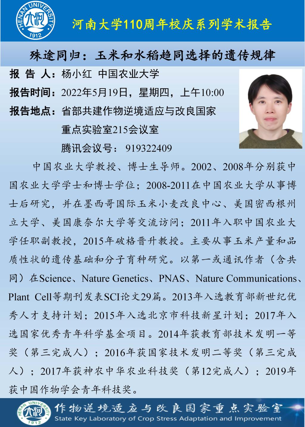 杨小红:殊途同归:玉米和水稻趋同选择的遗传规律(时间5.19)