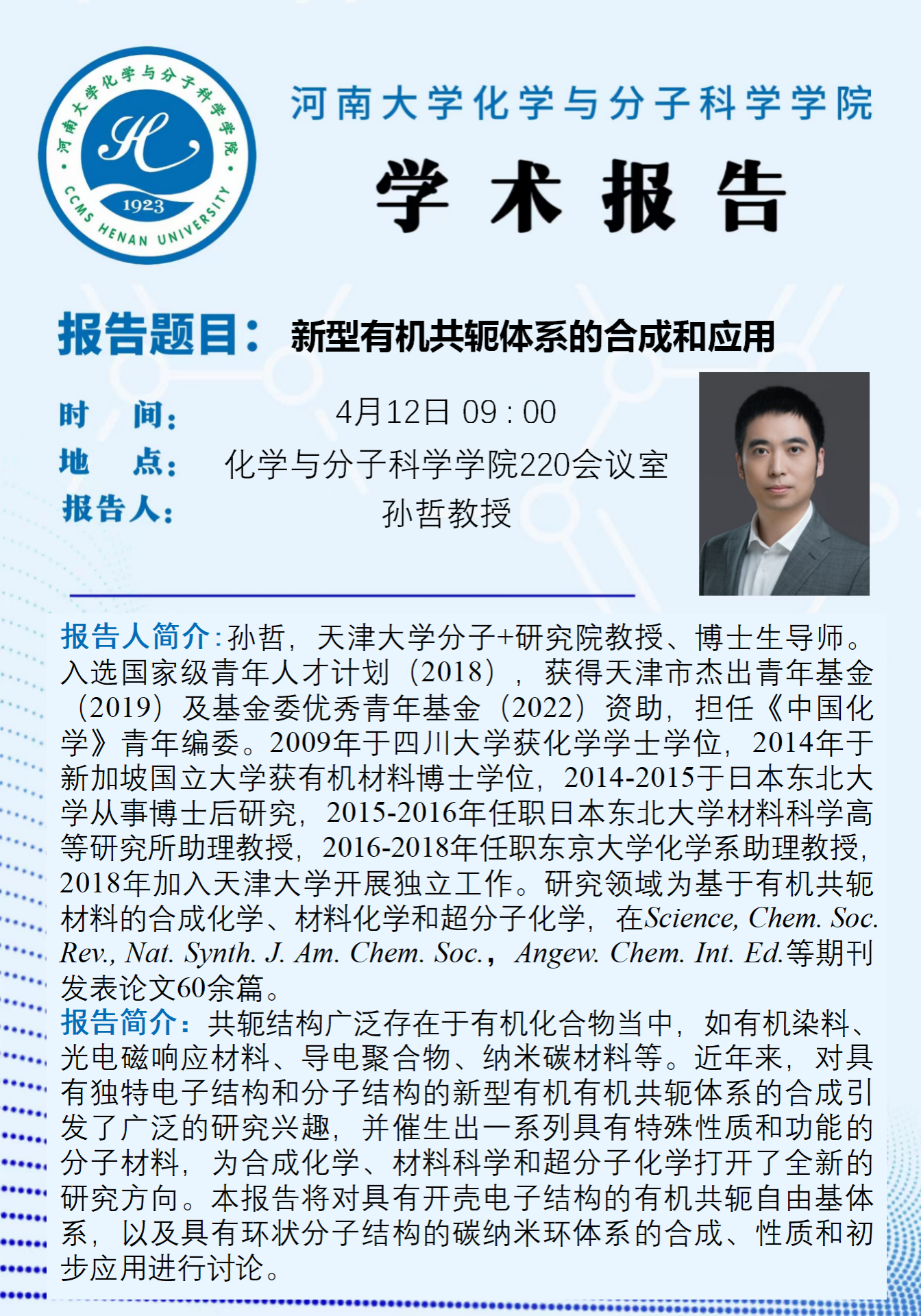 孙哲:新型有机共轭体系的合成和应用(时间:4月12日)