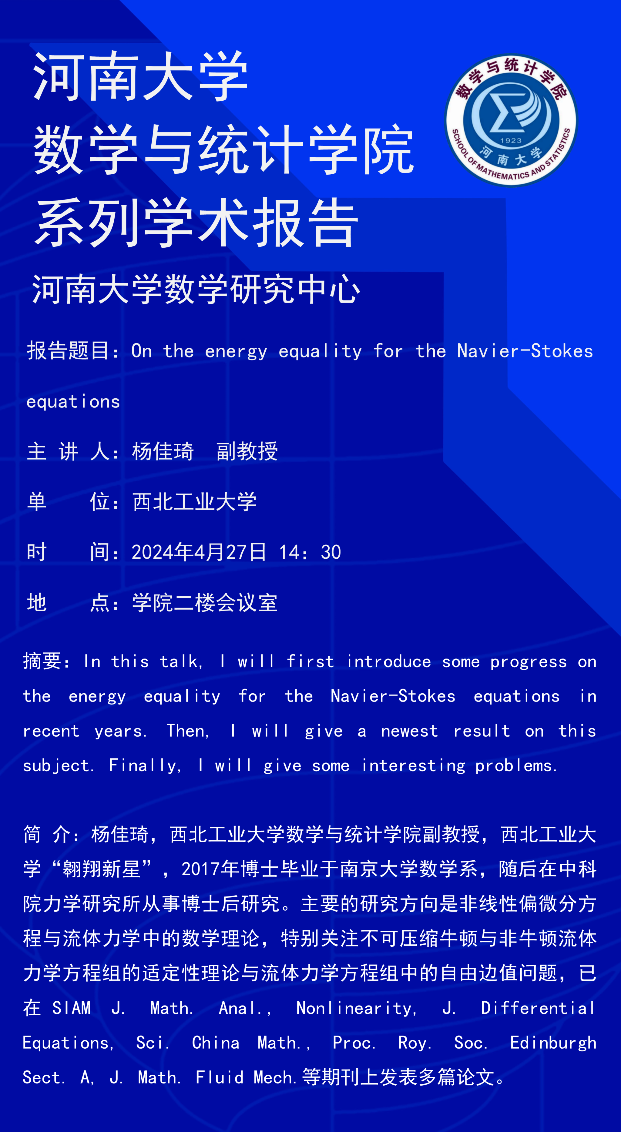 杨佳琦:On the energy equality for the Navier-Stokes equations(时间:4月27日)