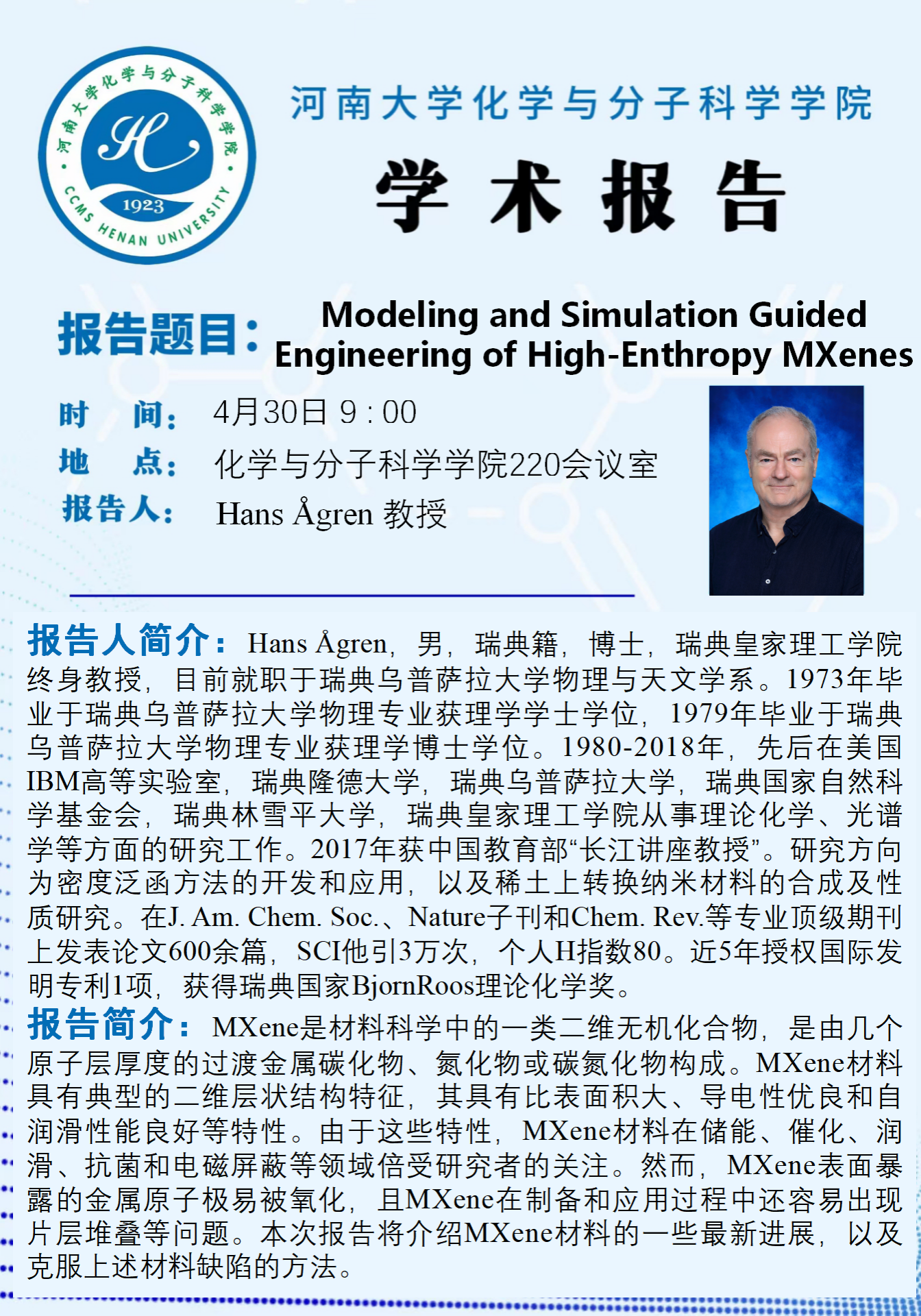 Hans Ågren:Modeling and Simulation Guided Engineering of High-Enthropy MXenes(时间:04月30日)