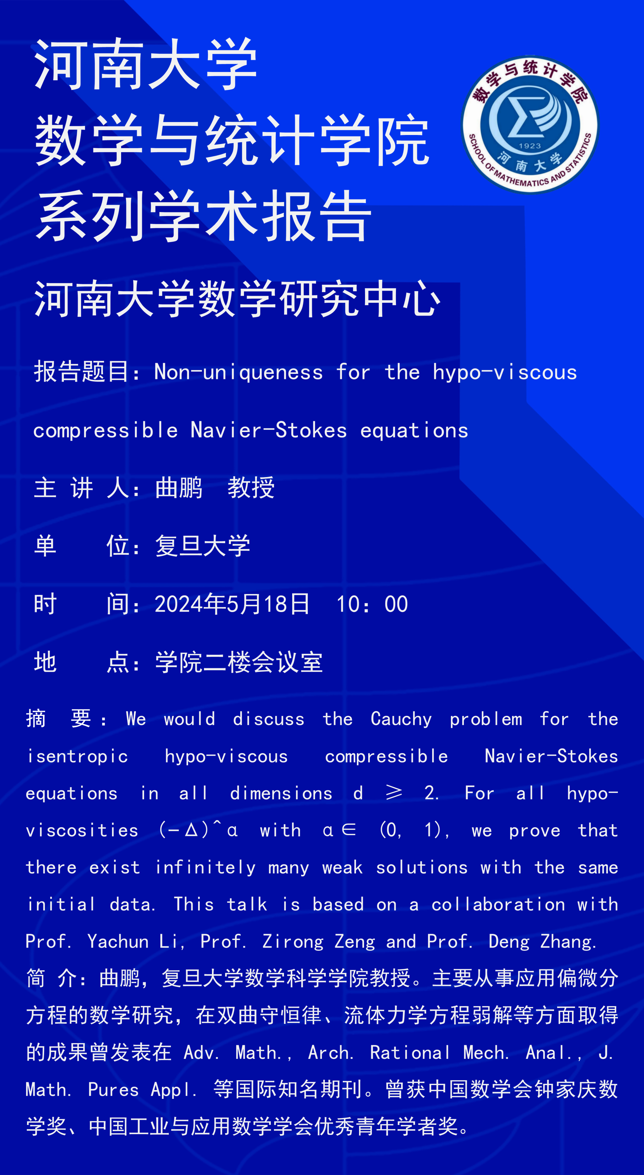 曲鹏:Non-uniqueness for the hypo-viscous compressible Navier-Stokes equations(时间:5月18日)