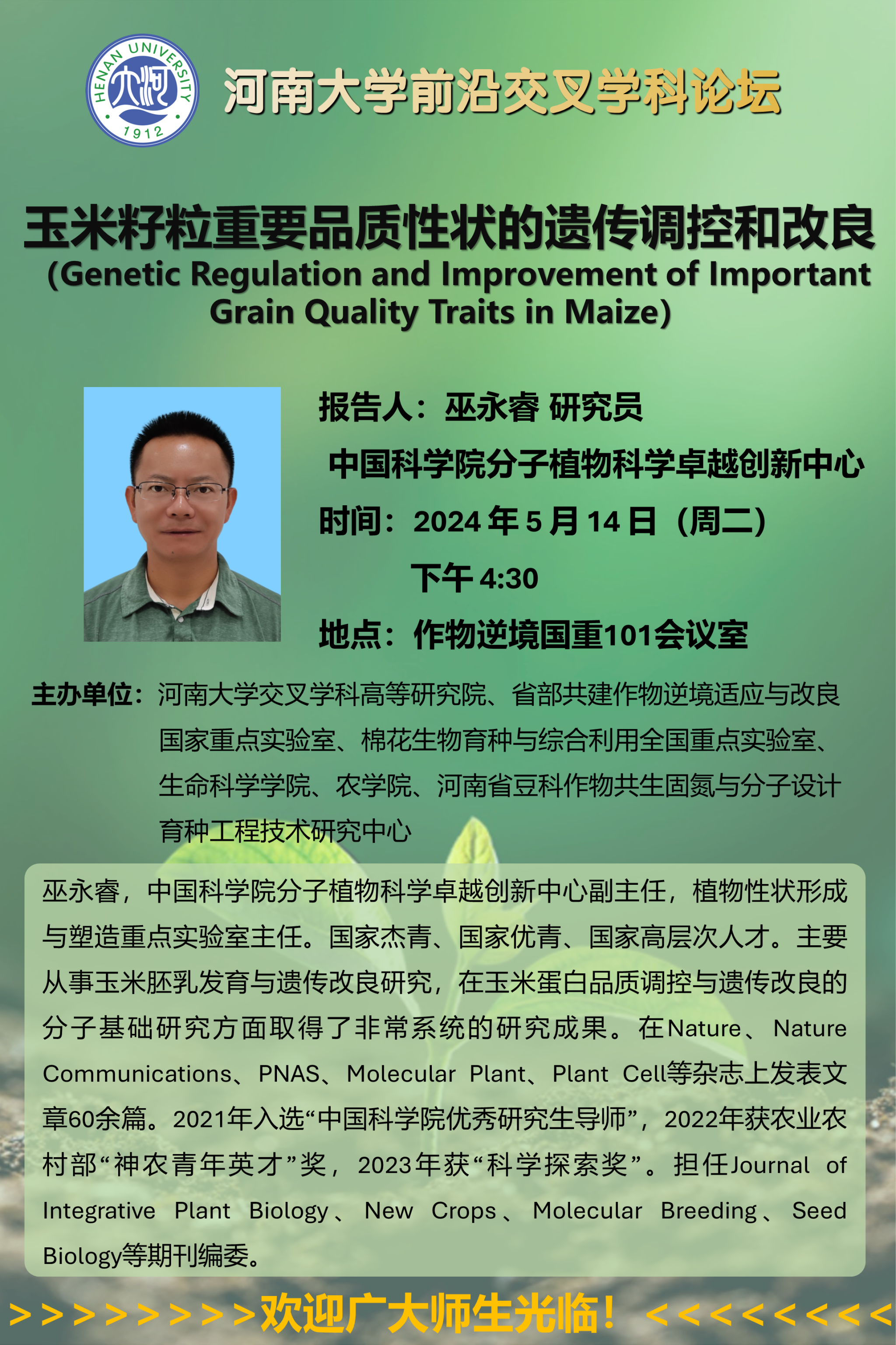 巫永睿:玉米籽粒重要品质性状的遗传调控和改良(时间:5月14日)