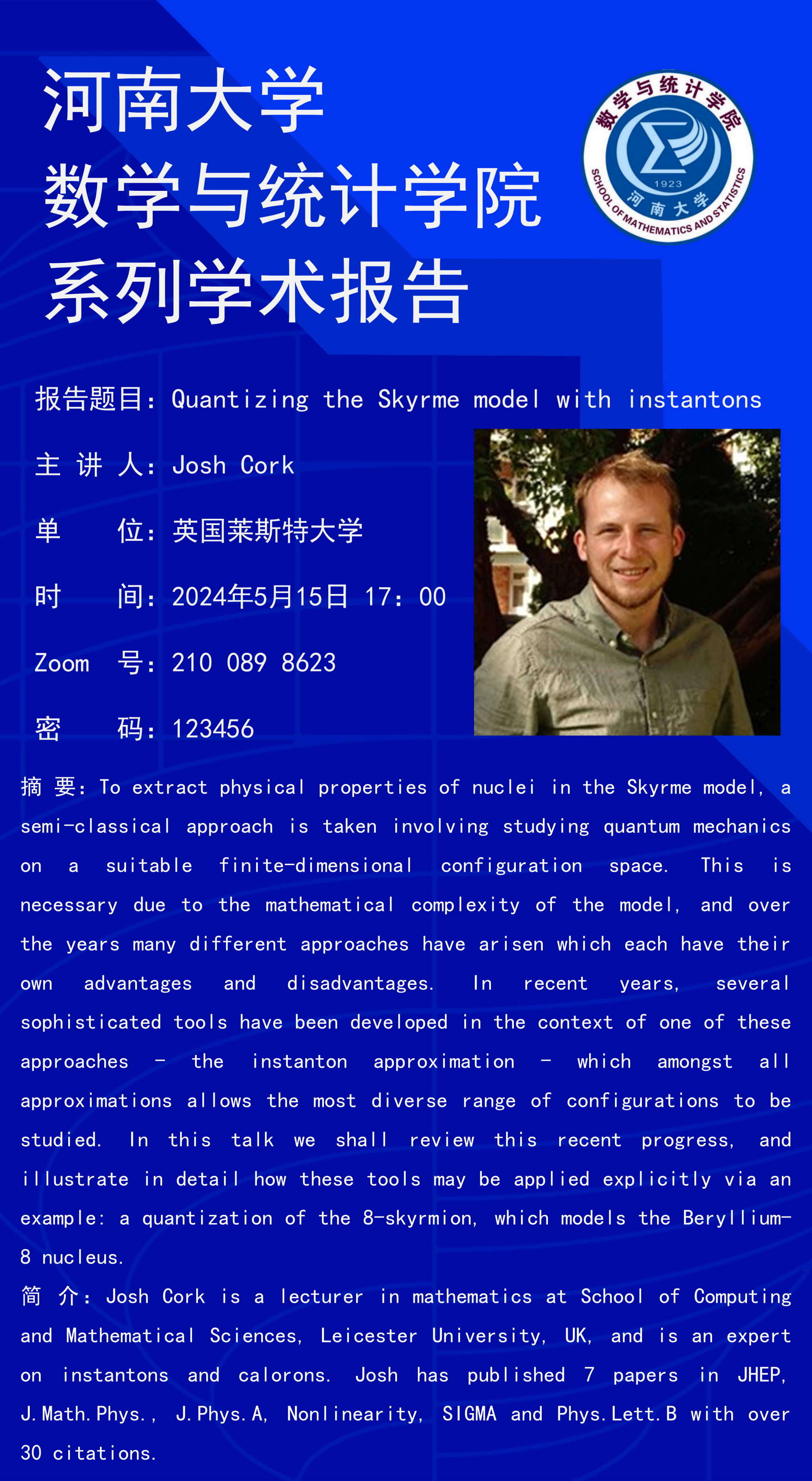 Josh Cork:Quantizing the Skyrme model with instantons(时间:5月15日)