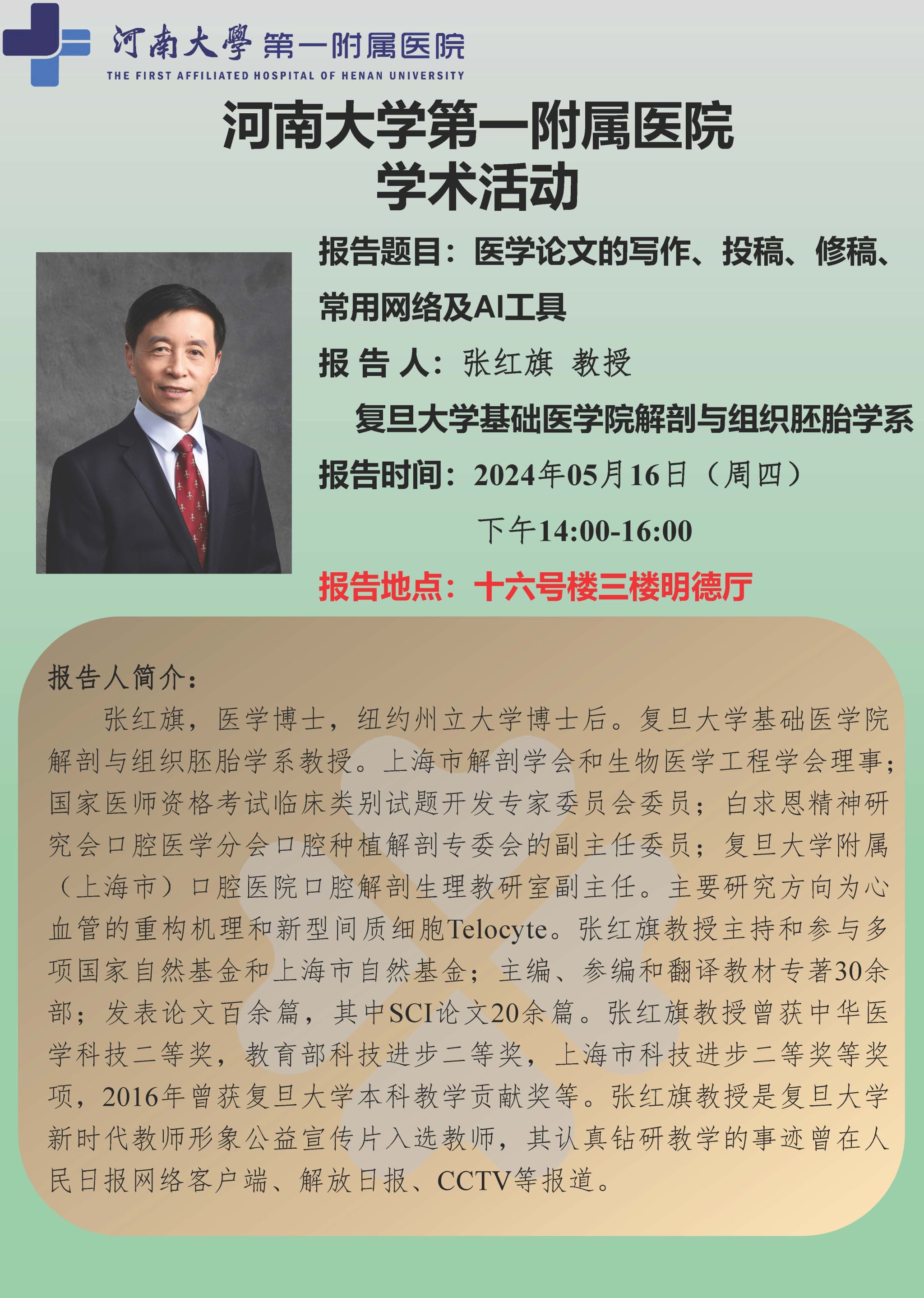 张红旗:医学论文的写作、投稿、修稿、常用网络及AI工具(时间:5月16日)