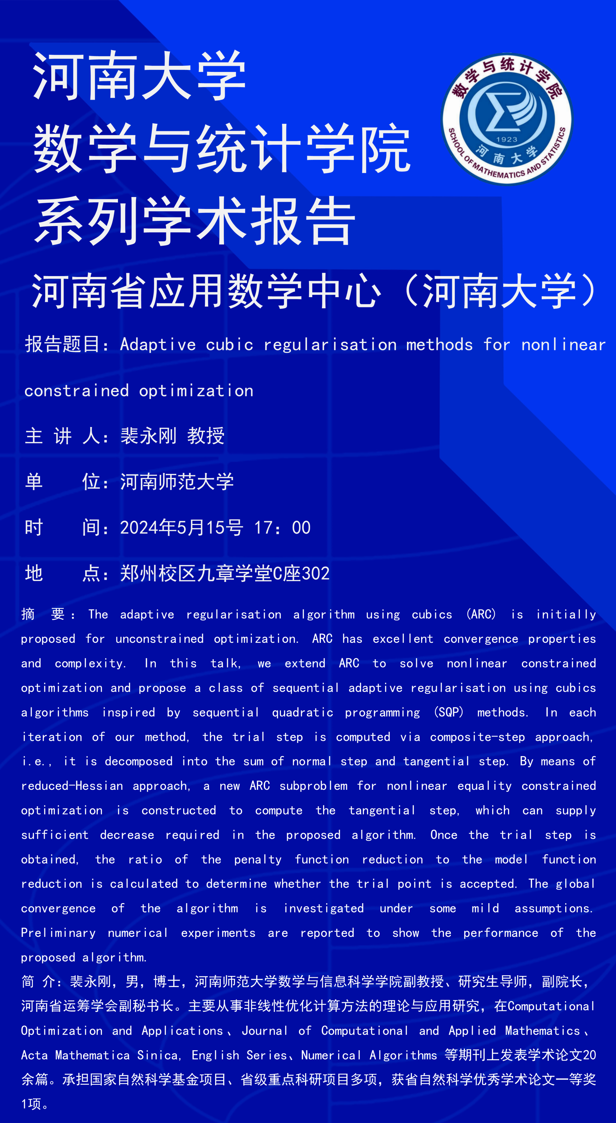 裴永刚:Adaptive cubic regularisation methods for nonlinear constrained optimization(时间:5月15日)