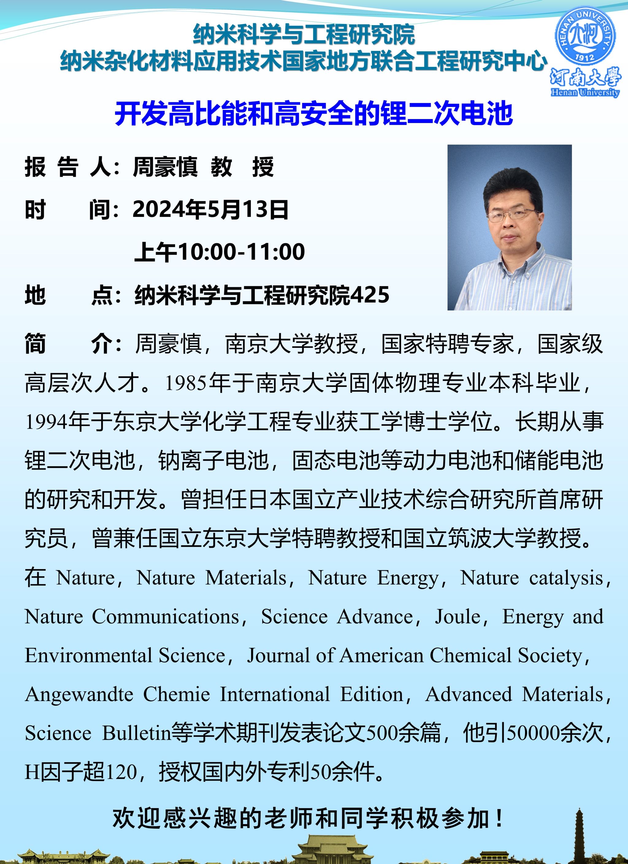 周豪慎:开发高比能和高安全的锂二次电池(时间:5月13日)