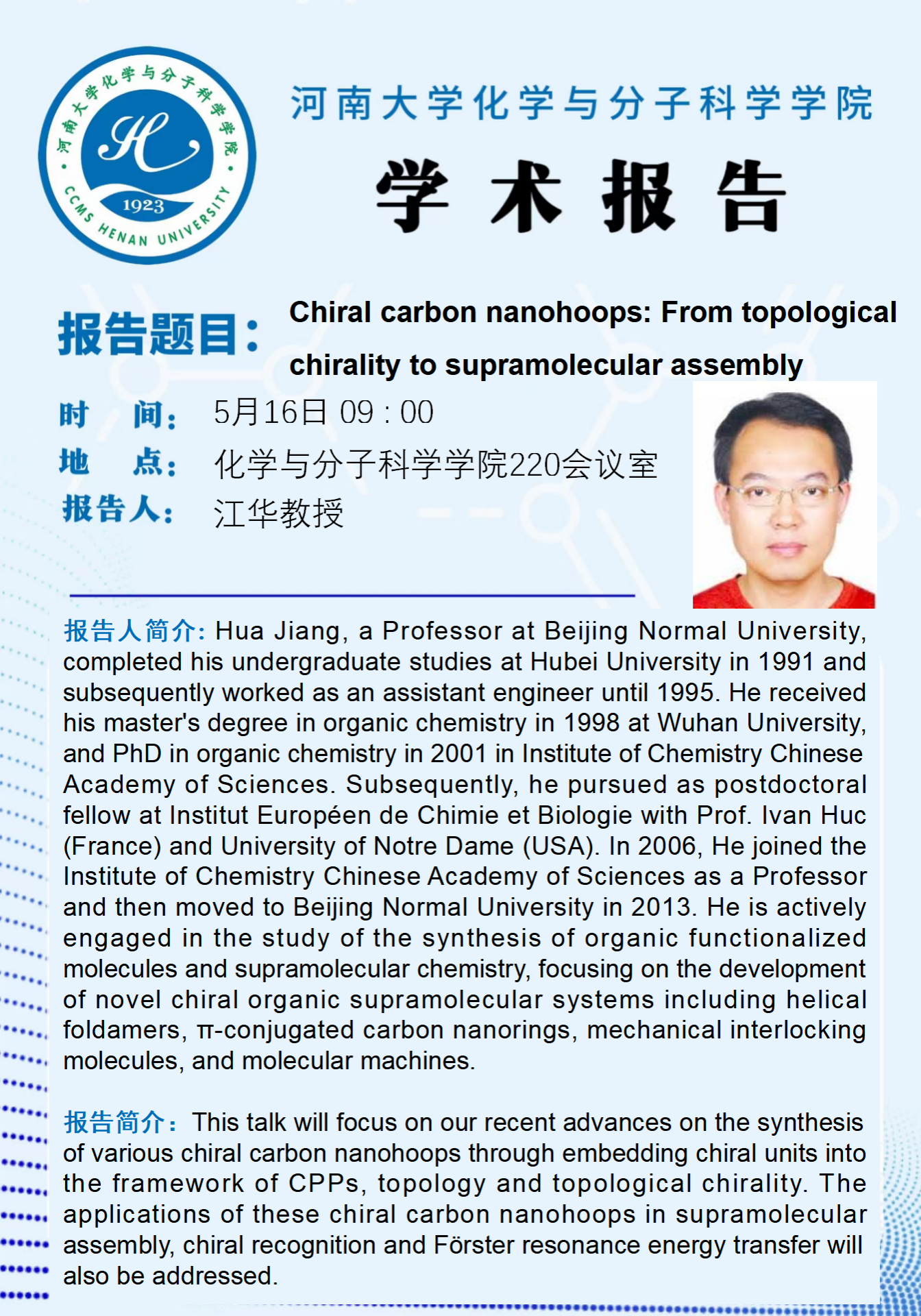 江华:Chiral carbon nanohoops: From topological chirality to supramolecular assembly(时间:5月16日)