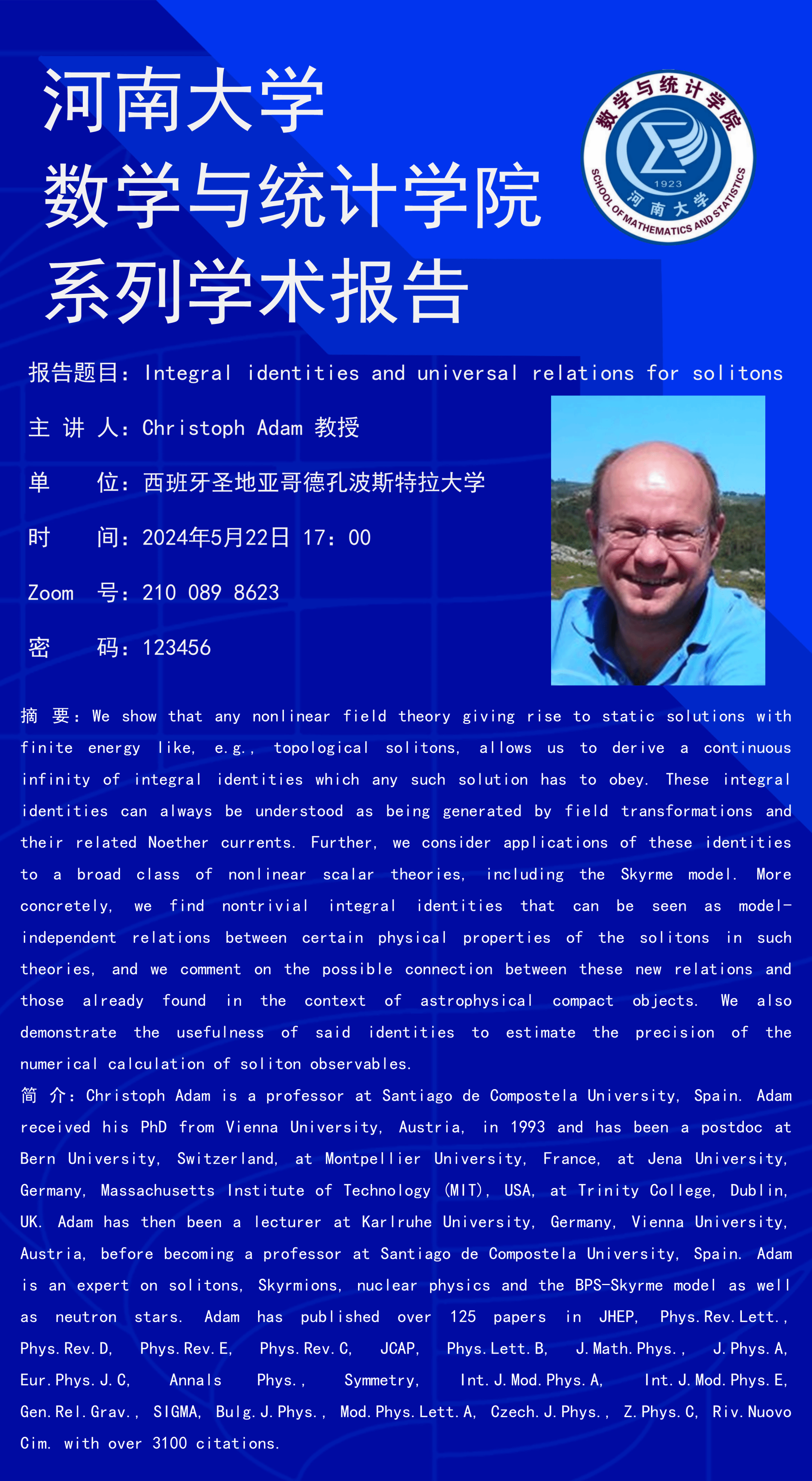 Christoph Adam:Integral identities and universal relations for solitons(时间:5月22日)