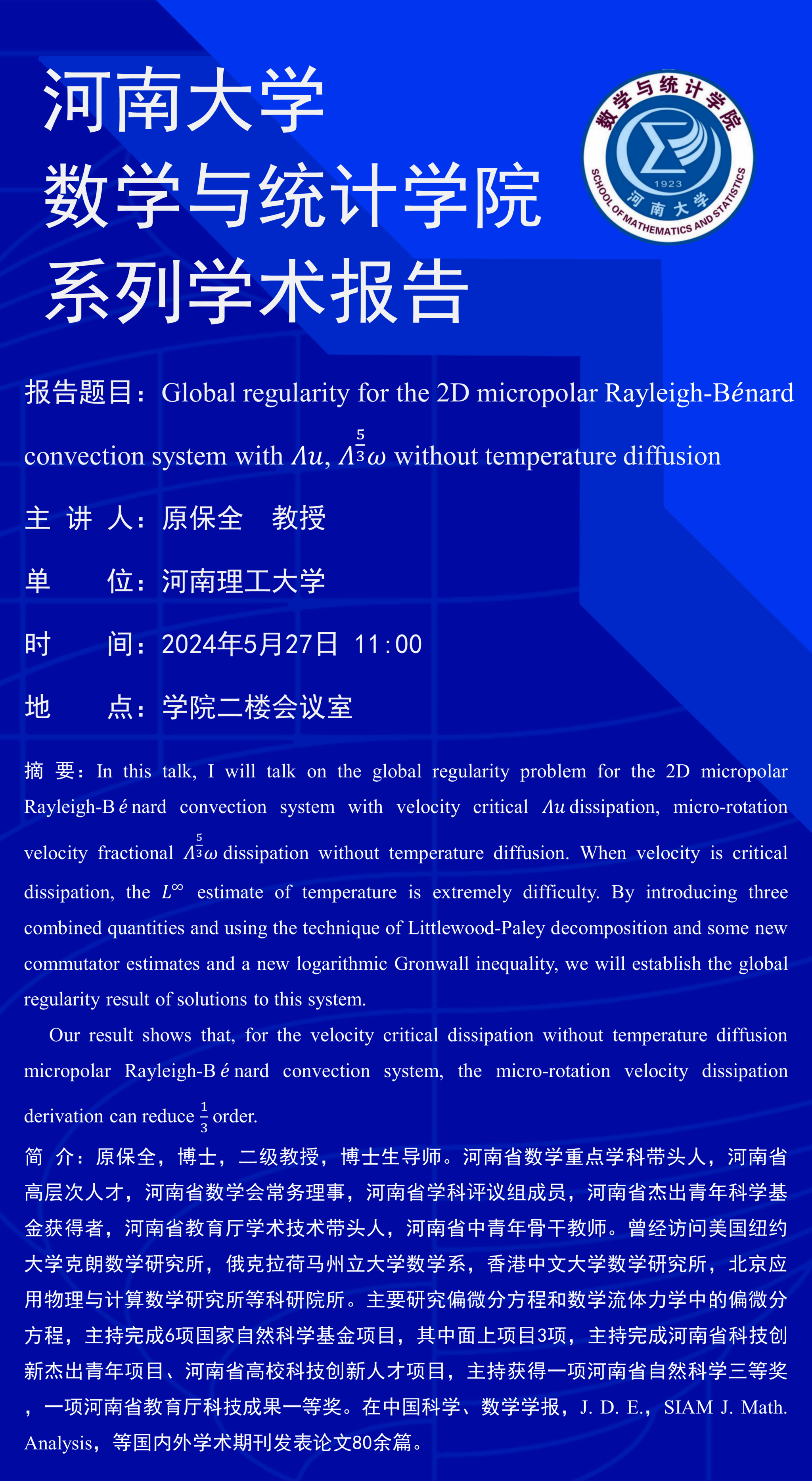 原保全:Global regularity for the 2D micropolar Rayleigh-Be ́nard convection system with Λu, Λ^(5/3) ω without temperature diffusion(时间:5月27日)