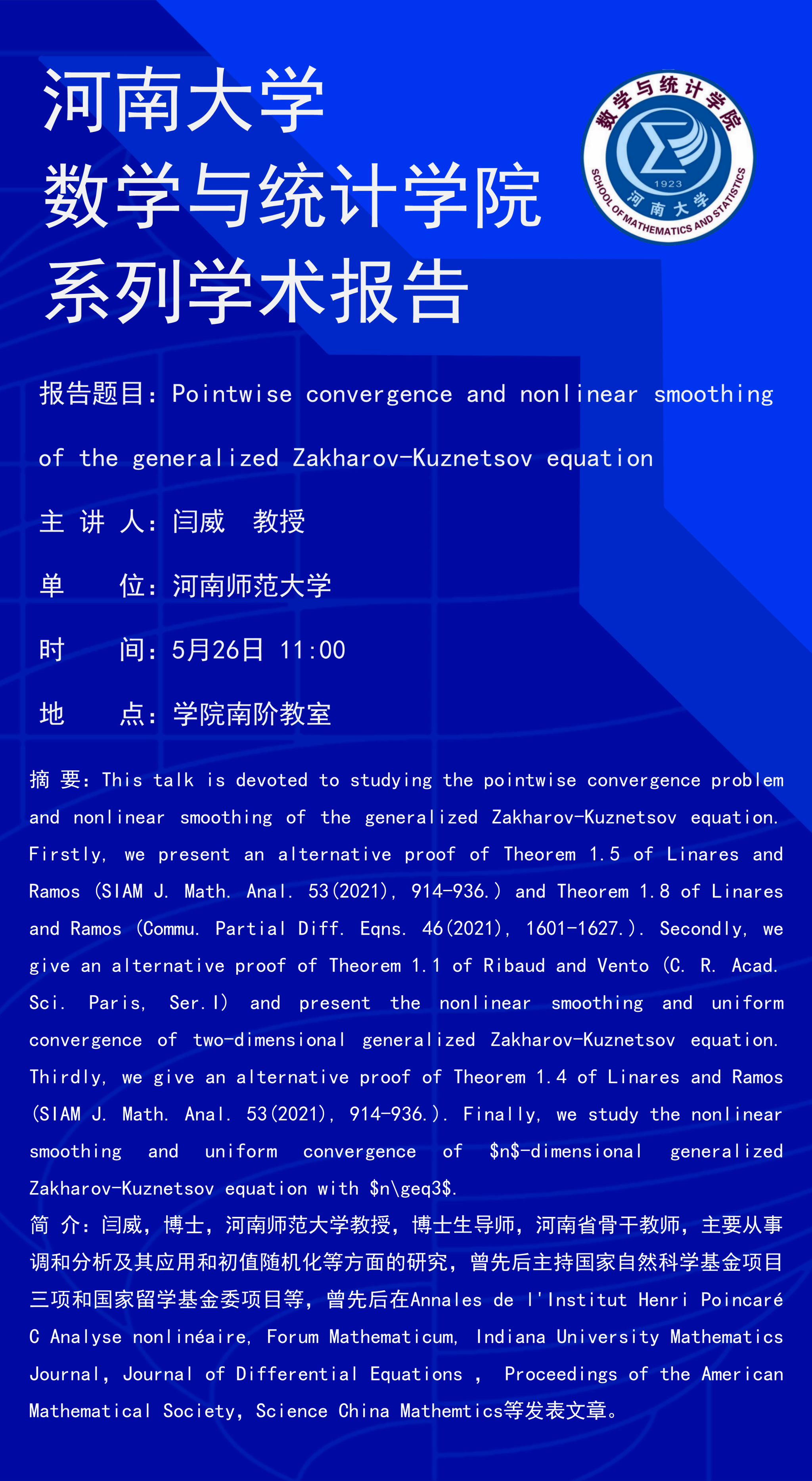 闫威:Pointwise convergence and nonlinear smoothing of the generalized Zakharov-Kuznetsov equation (时间:5月26日)