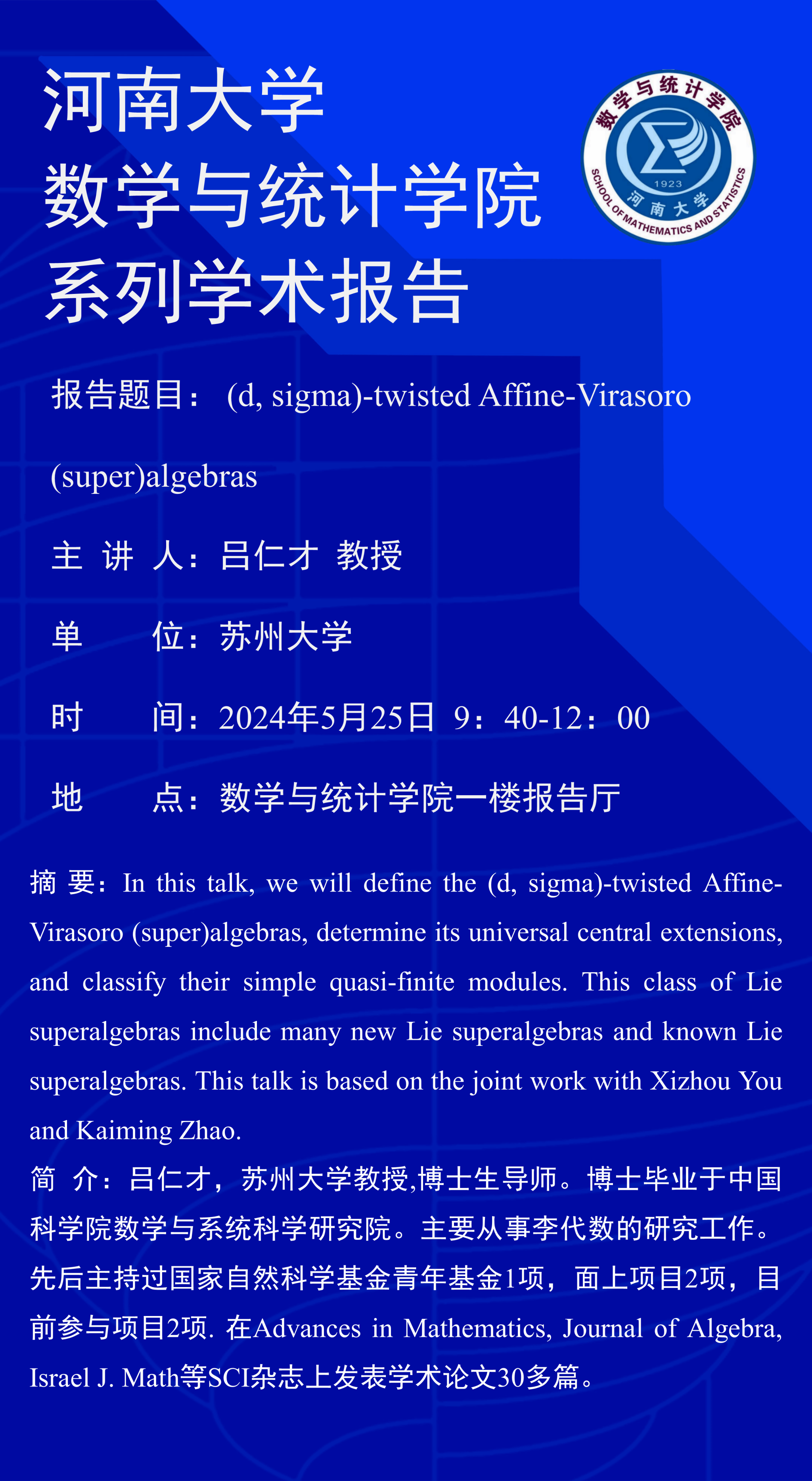 吕仁才:(d, sigma)-twisted Affine-Virasoro (super)algebras(时间:5月25日)