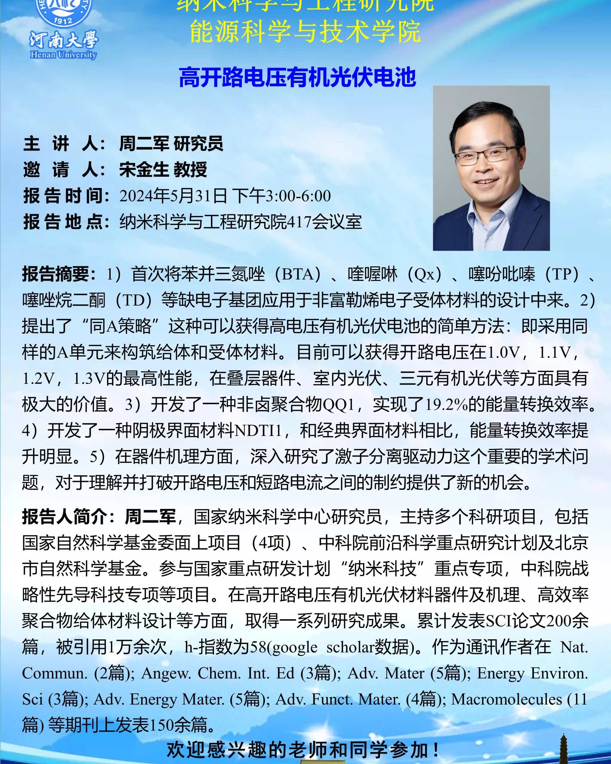 周二军:高开路电压有机光伏电池(时间:5月31日)