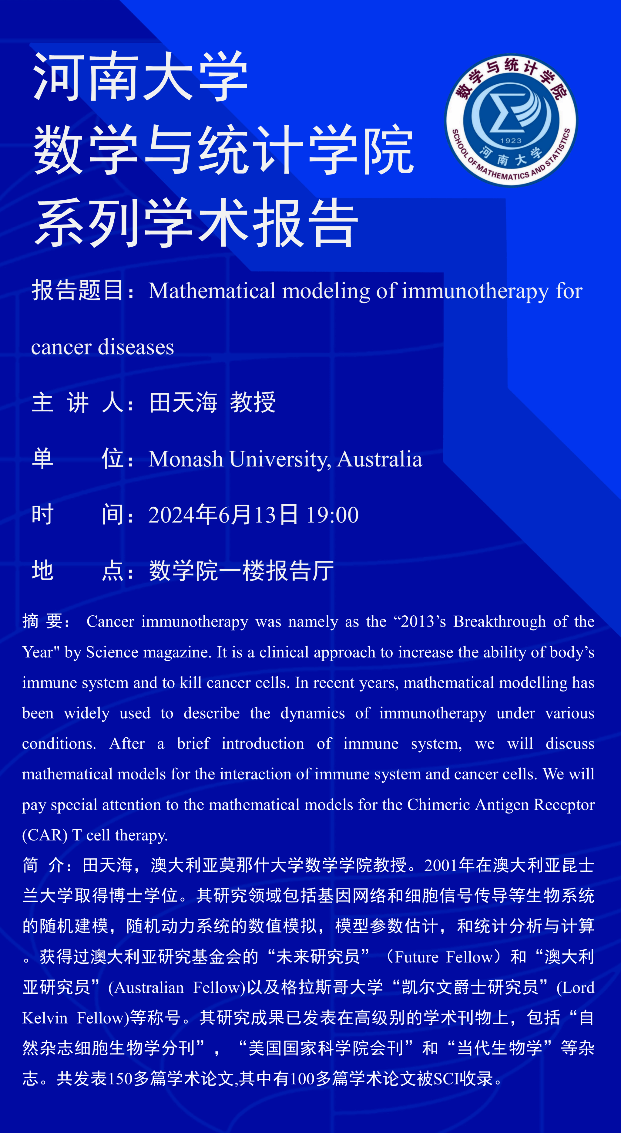 田天海:Mathematical modeling of immunotherapy for cancer diseases(时间:6月13日)