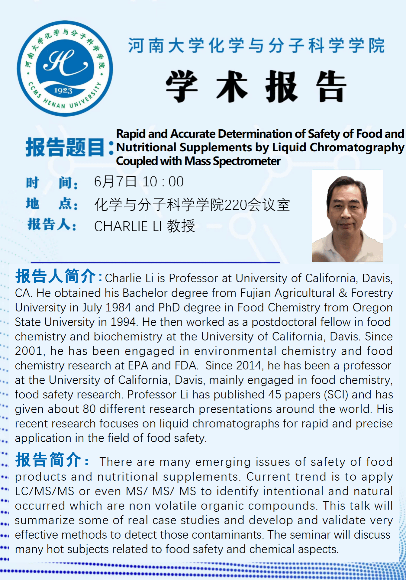 CHARLIE LI:Rapid and Accurate Determination of Safety of Food and Nutritional Supplements by Liquid Chromatography Coupled with Mass Spectrometer(时间:06月07日)
