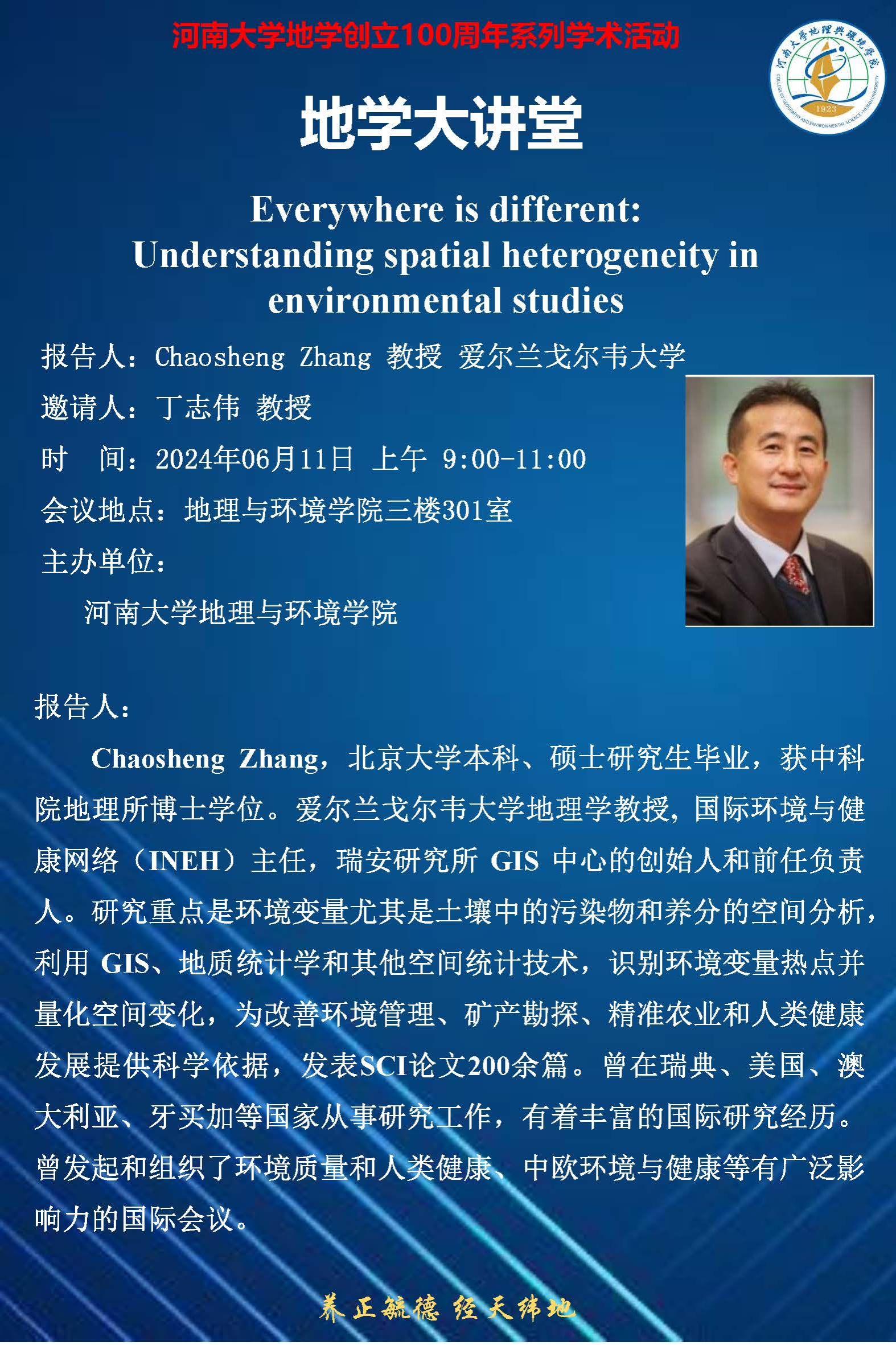 CHAOSHENG ZHANG:Everywhere is different: Understanding spatial heterogeneity in environmental studies(时间:6月11日)