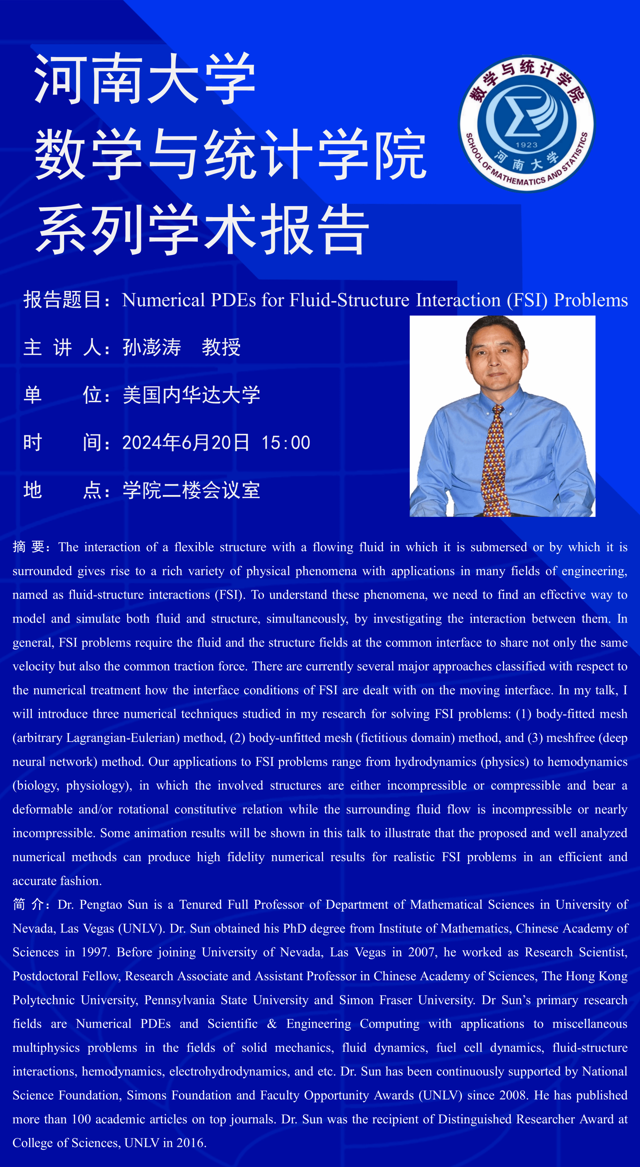 孙澎涛:Numerical PDEs for Fluid-Structure Interaction (FSI) Problems(时间:6月20日)