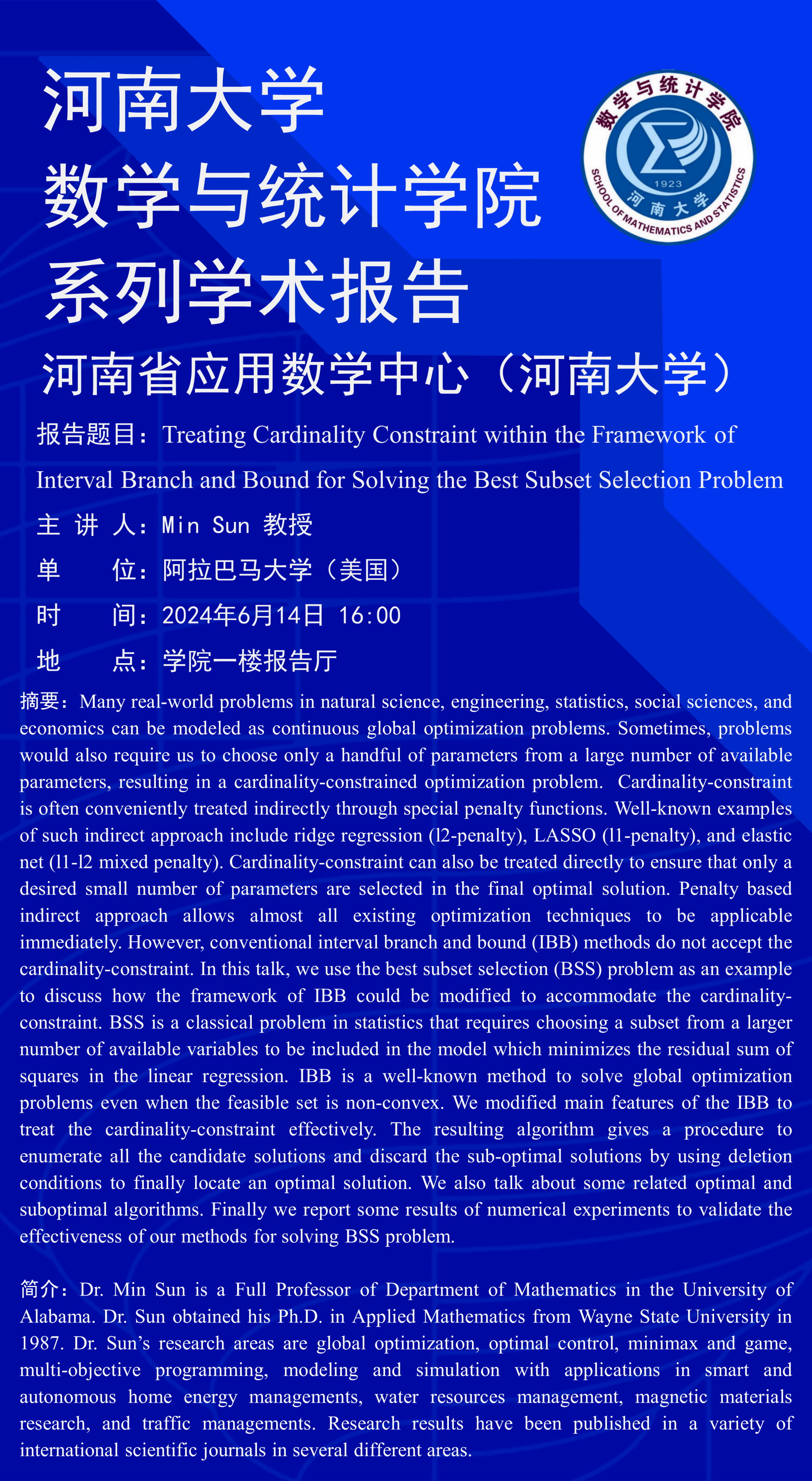 Min Sun:Treating Cardinality Constraint within the Framework of Interval Branch and Bound for Solving the Best Subset Selection Problem(时间:6月14日)